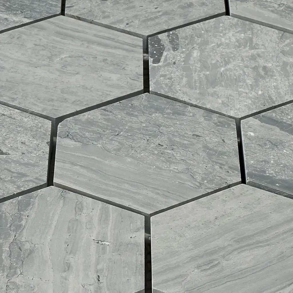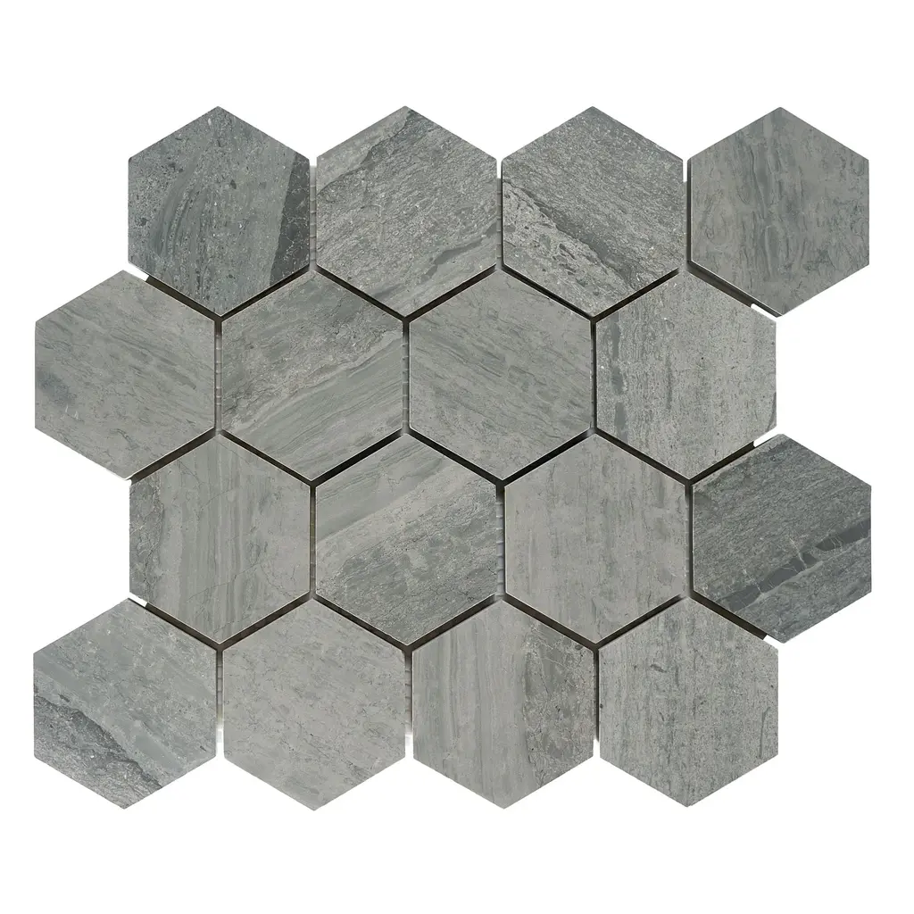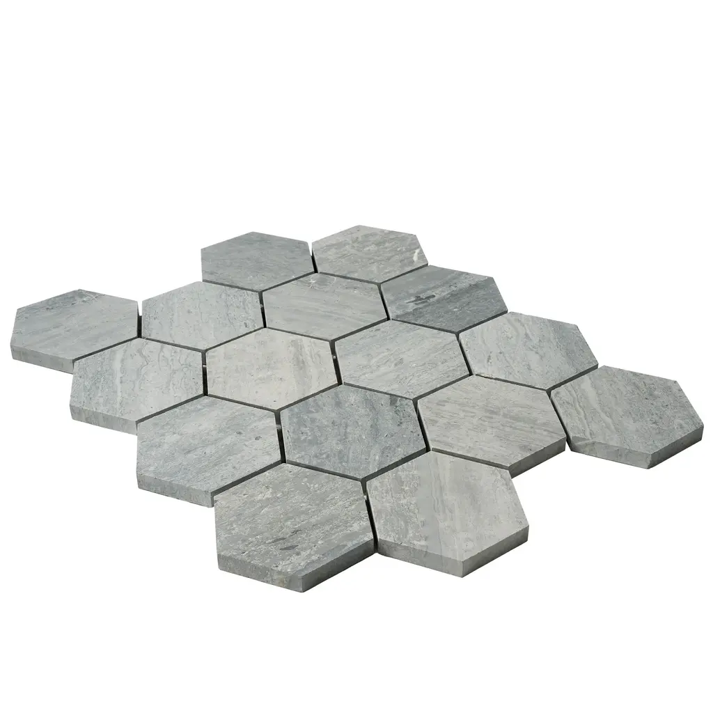 Marinewood 3"x3" Honed is a mosaic tile in a honeycomb shape. It features a honed finish for a smooth, matte look and a light blue color that mimics driftwood. This tile can be used for flooring or wall covering and adds a unique touch to the design with its hexagonal shape. The honed finish gives the tile a sophisticated appearance, making it suitable for both residential and commercial spaces. The tile can enhance the design of kitchens, bathrooms, and other living areas.What's included?Product Details Sample Details