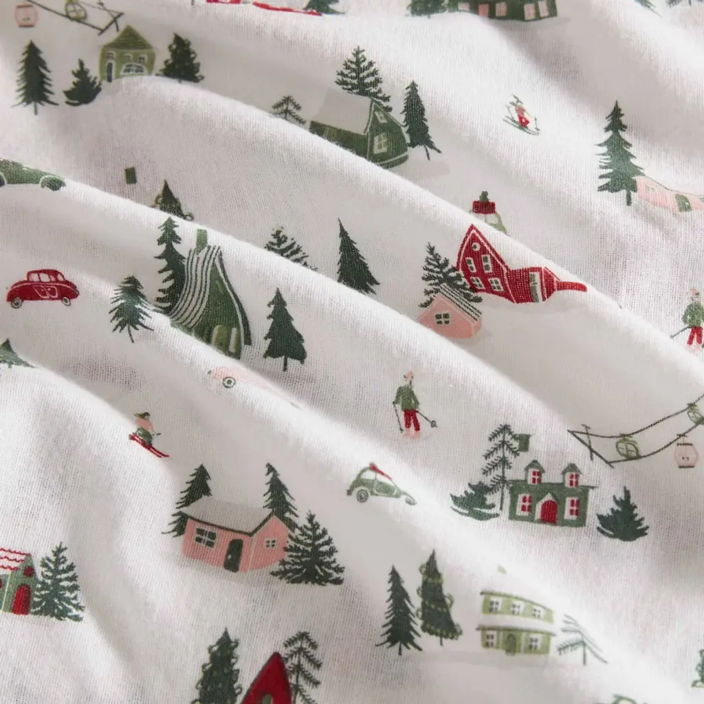 Cozy up in classic winter style with the Martha Stewart Ski Village flannel sheet set. Featuring a nostalgic alpine scene of snow-covered cabins, skiers, evergreen trees, and charming village details, this set brings the joy of a mountain escape right to your bedroom. Made from 100% cotton flannel, the sheets are brushed for an ultra-soft hand and breathable comfort that lasts all season long. Whether paired with the matching comforter or layered with Solids, this whimsical winter print adds warmth, personality, and timeless Martha Stewart style to any space.