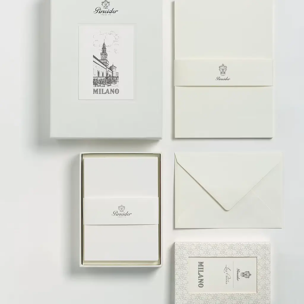 This refined box boasts a print of a drawing depicting a glimpse of the Castello Sforzesco, a symbol of the city of Milan. Inside the box are 24 laid and watermarked Pineider cardboards with their corresponding white tissue-lined envelopes sharing the same characteristics. The signature Pineider logo in relief dry-imprinted on the envelopes completes this exclusive stationery set. For other color options please contact the Concierge.