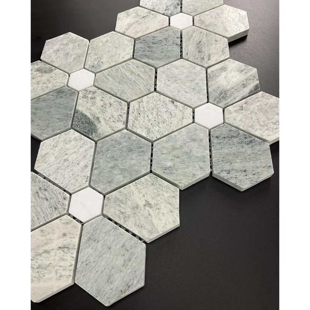Color: Ming Green and Thassos White Material: Natural Marble Overall Product Weight: 2.75 lb. Dimensions Mosaic Sheet: 12.625'' W X 11.875'' L Individual Tile: 6 W x 6 L (Each Pattern) Finish: Polished Overall Thickness: 0.31 Surface Area per Carton: 8 SqFt It is mesh-mounted for easy installation. Installation Area: Kitchen Backsplash, Fireplace Front, Bathroom Wall, Shower Wall