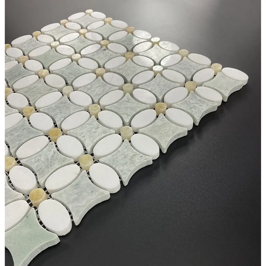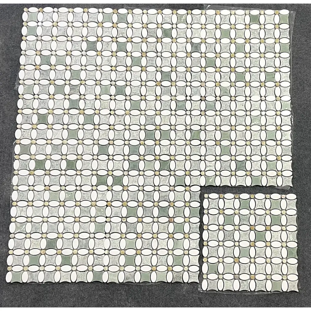Color: Thassos White, Ming Green and Honey Onyx Material: Natural Marble Overall Product Weight: 3.42 lb. Dimensions Mosaic Sheet: 12'' W X 12'' L Individual Tile: Multi-Sizes Finish: Polished Overall Thickness: 0.31 Surface Area per Carton: 10 SqFt It is mesh-mounted for easy installation. Installation Area: Kitchen Backsplash, Fireplace Front, Bathroom Wall, Shower Wall, Bathroom Floor, Bathroom Wall.