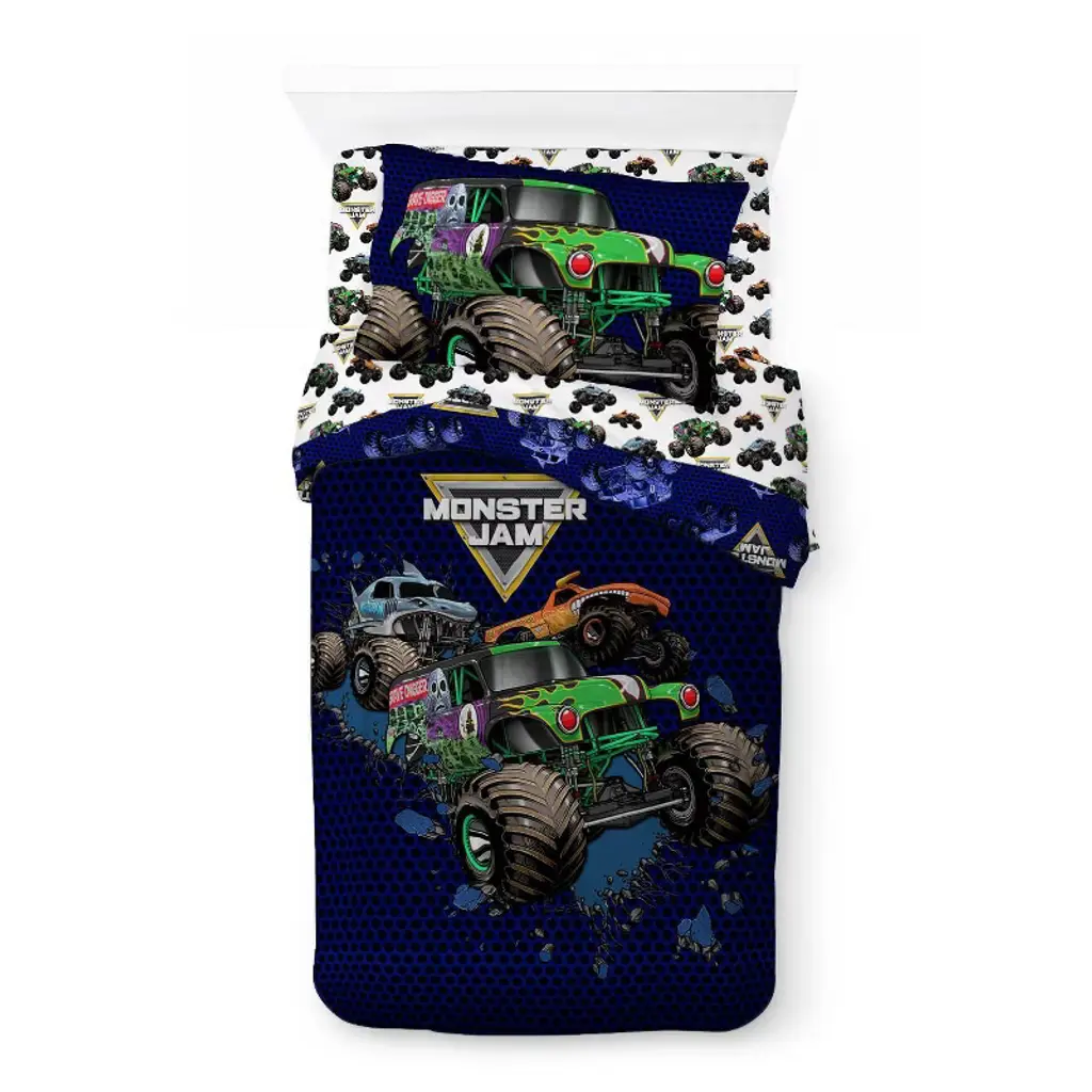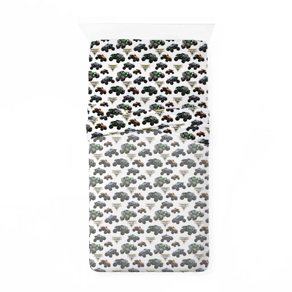 Gear up your little monster truck fan’s bedroom with this Monster Jam twin sheet set, featuring a flat sheet (96" x 66"), fitted sheet (75" x 66"), and pillowcase (20" x 30"). Made from 100% soft polyester, it’s durable, cozy, and perfect for everyday use. Machine wash cold and tumble dry low for easy care. Featuring bold, action-packed designs, this set brings excitement and comfort to every bedtime.