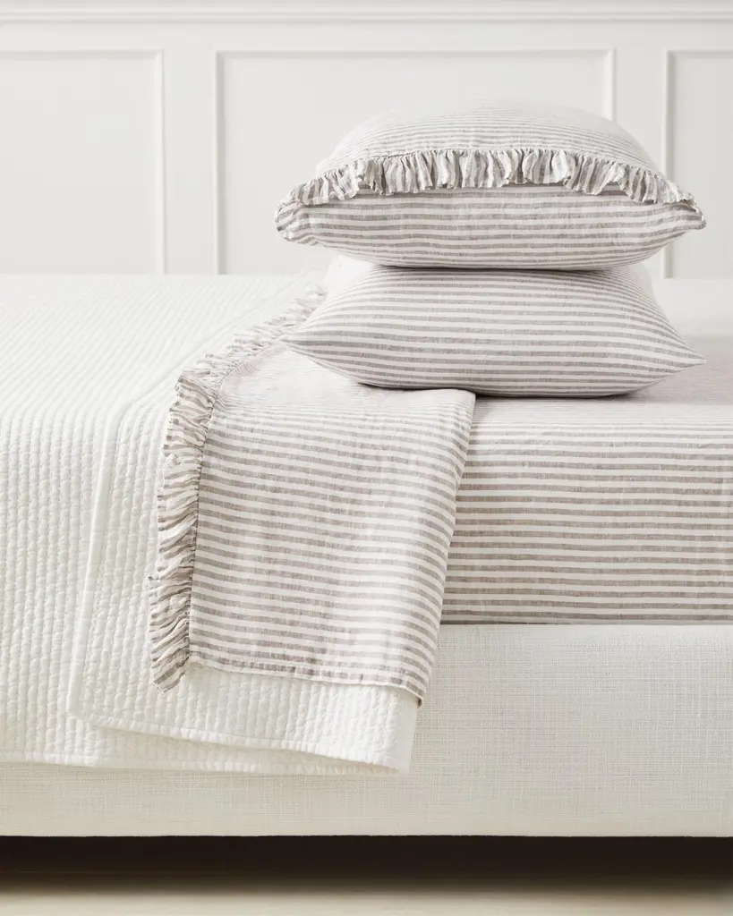 The frill of it. A vision in stripes, yarn dyed, ruffled linen. Feminine. Fabulous.