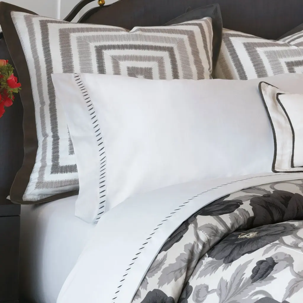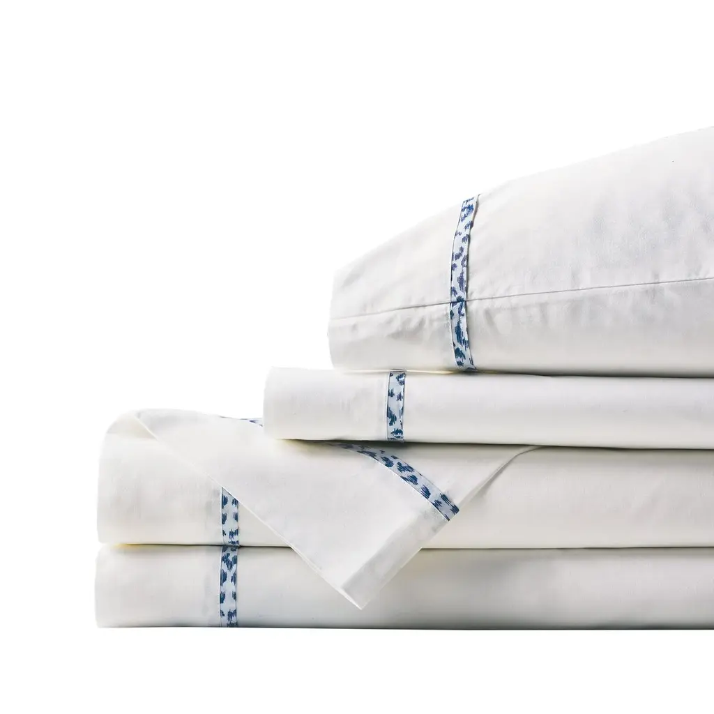 Woven in Italy of fine Egyptian cotton sateen, this silky-soft sheet set is finished with neutral-hued embroidery on the hems of the flat sheet and pillowcases. The fitted sheet has a 17" gusset.