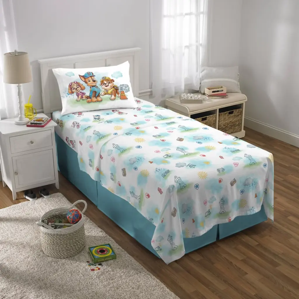 Embrace the softness in this beautiful Paw Patrol sheet set. Featuring all of the Paw Patrol characters that your little one knows and loves, this is a perfect watercolor accent to any Paw Patrol fans bedroom. Twin sheet set includes: flat sheet, fitted sheet and pillowcase.Sheet set coordinates with comforter, pillowcase and throw (sold separately).
