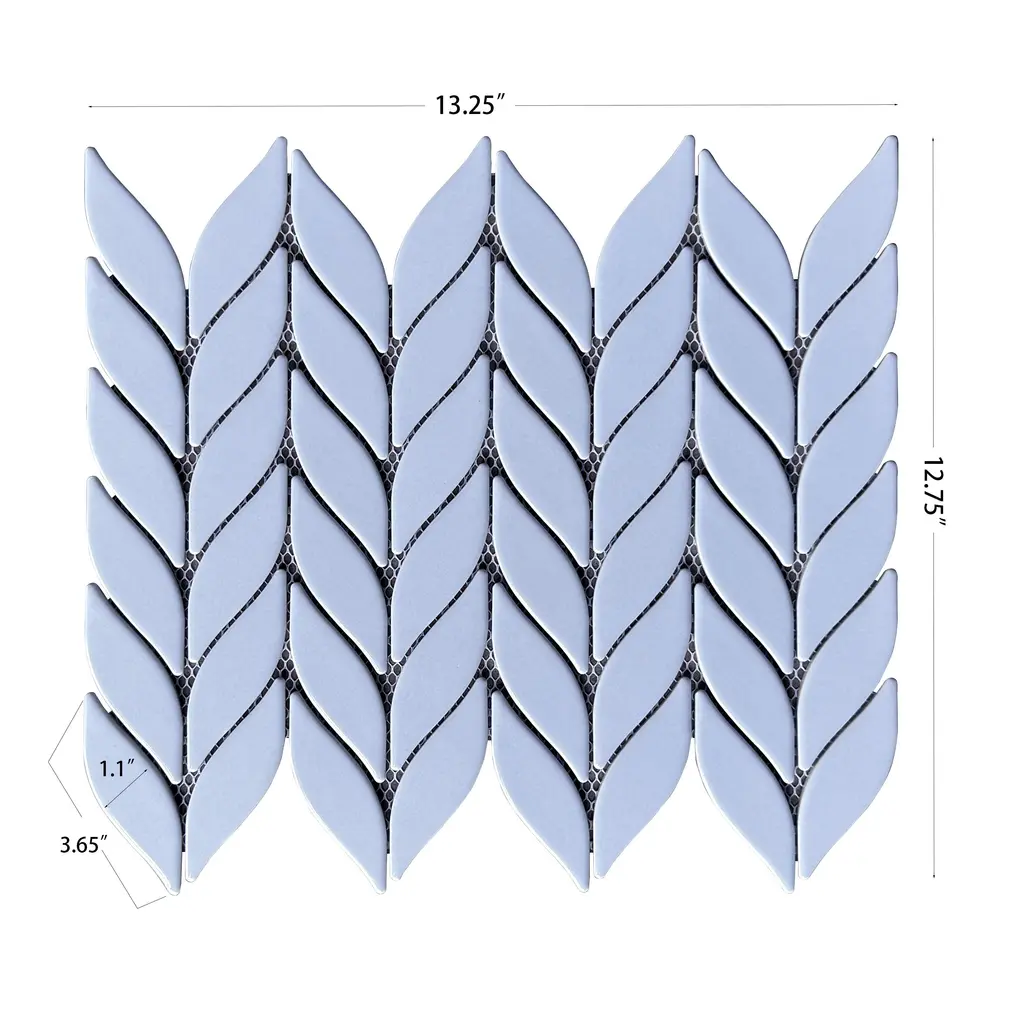Material: Porcelain Style: Petal / Leaf Color: Blue Mosaic Sheet: 13.25'' W X 12.75" L Individual Tile: 3.65" x 1.1" Overall Thickness: 0.22'' Overall Product Weight: 2.3 lb. Surface Area per Carton: 15 square feet Tile Type: Mosaic Sheet Tile Backing Type: Mesh Backed Floor Use: Yes Sold In Carton: Yes (15 Sheets) Water Absorption Rating: Semi Vitreous: absorbs 3%-7% Water Performance Level: Wate Resistant Shade Variation: V1 Uniform Appearance Finish: Matte Recommended Grout Joint Size: 1/8 inches Mounting / Installation Location: Backsplash; Bathroom; Shower; Fireplace Surround; Walls; Floors.