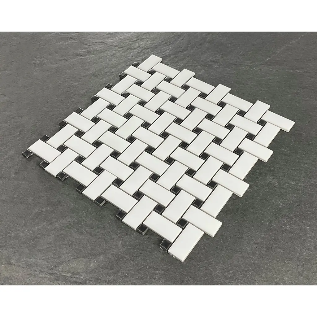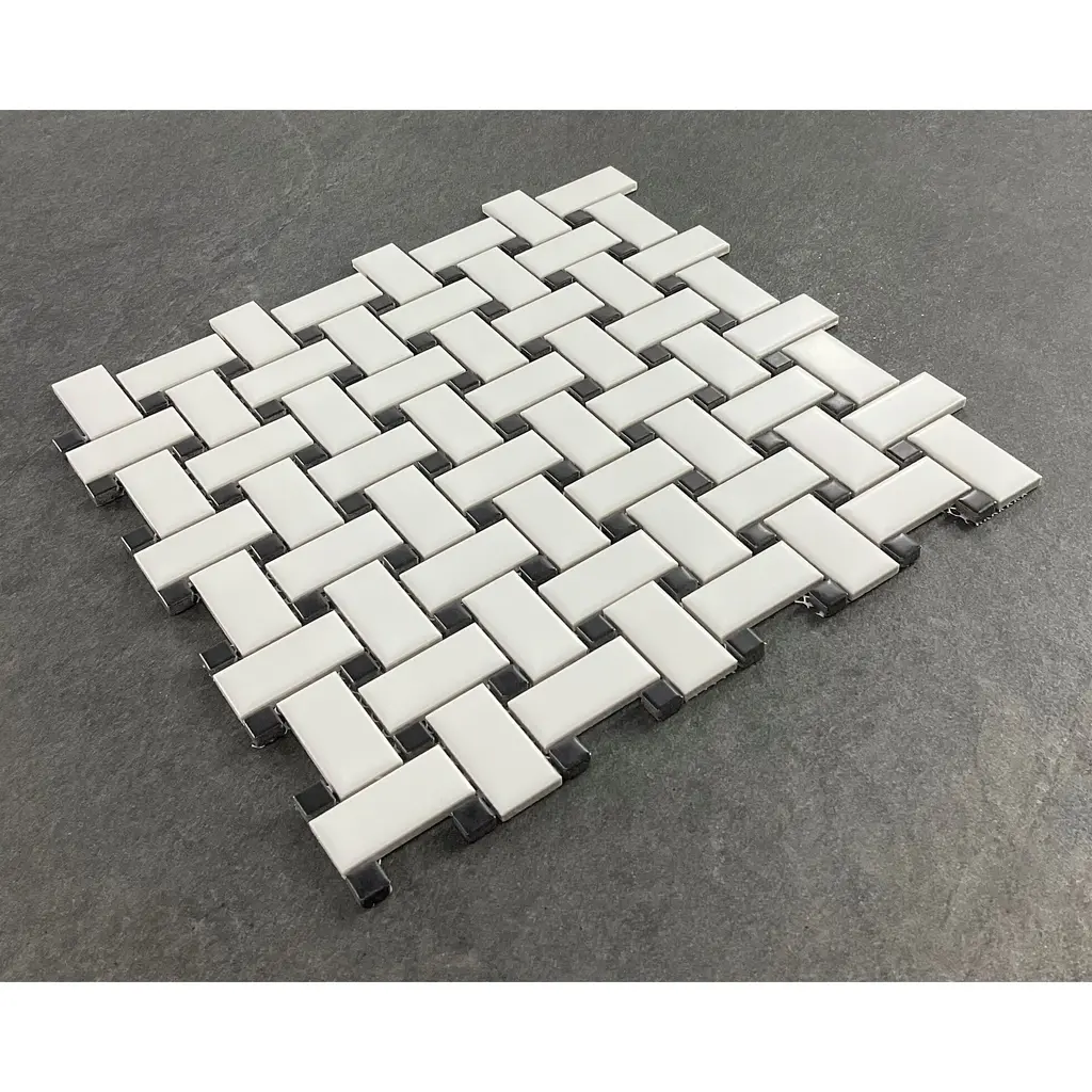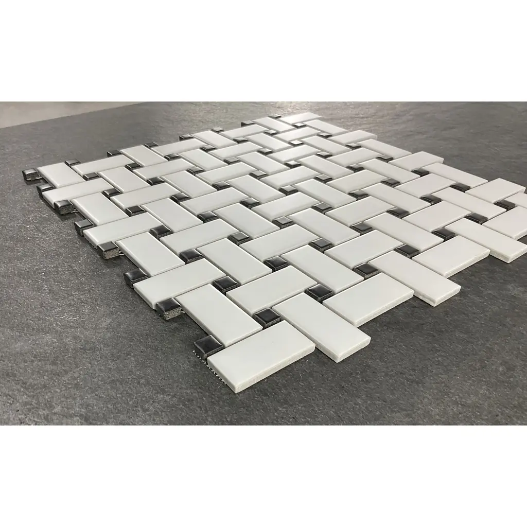 Color: White & Black (Matte) Style: Basketweave PorcelainMaterial: Porcelain TilesOverall Product Weight: 2.42 lb. Dimensions Mosaic Sheet: 11.75'' W X 11.75'' L Individual Tile: 1 x 2 (White), 1/4 x 1/4 (Black)Overall Thickness: 0.22 Surface Area per Carton: 14.7 SqFt Mesh-Mounted TilesInstallation Area: Kitchen Backsplash, Bathroom Wall, Shower Wall