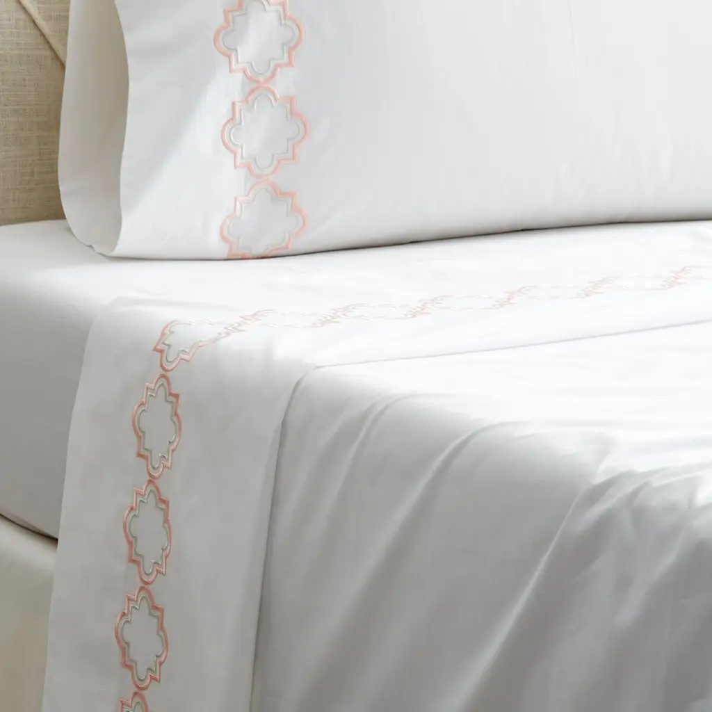 This exquisite Egyptian cotton sheet set, offered exclusively through One Kings Lane, is made from the finest Italian percale and embroidered in the USA with an elegant, two-tone quatrefoil design.