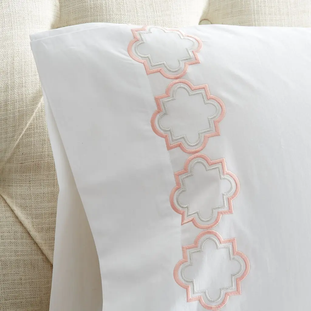 This exquisite Egyptian cotton sheet set, offered exclusively through One Kings Lane, is made from the finest Italian percale and embroidered in the USA with an elegant, two-tone quatrefoil design.