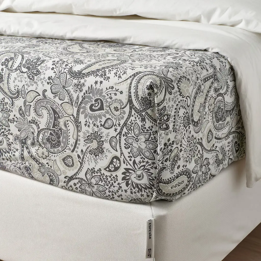 RODGERSIA Sheet set - gray/white King. The fitted sheet fits mattresses with a thickness up to 25 cm since the fitted sheet has elastic edging all around. Viscose is made from wood pulp and has a smooth surface that feels cool and soft to the touch. 152 thread count.