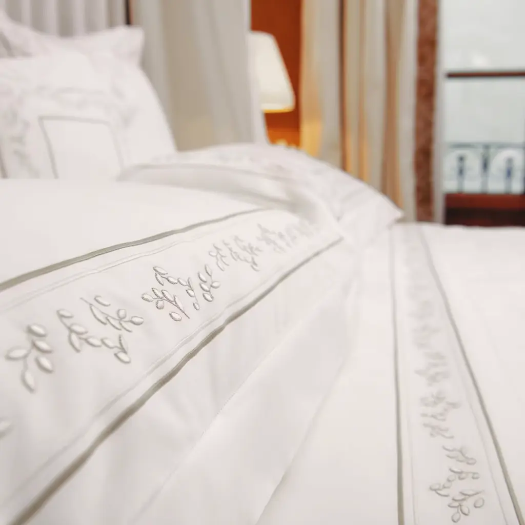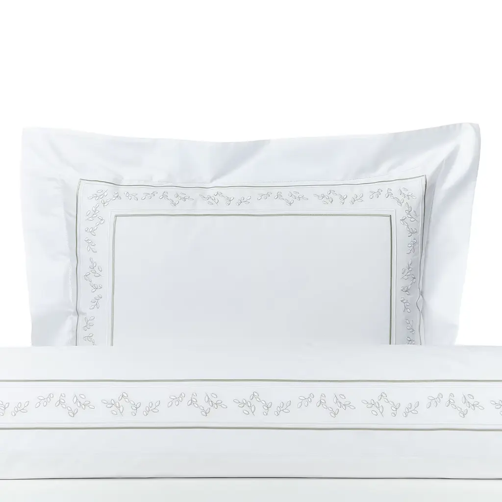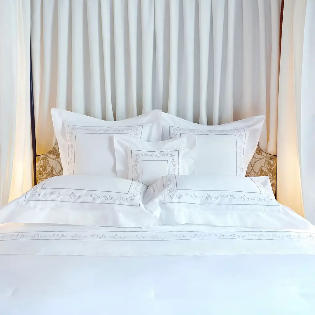 A design which never fades nor goes out of style. For those who dream their nights away basking in beauty. Threads are made of super-fine gauge fibers woven into a crisp yet extremely soft product. Verderoccia sheets are made to dive in, sleeping is optional. A signature embroidery on the new Estremo percale, Made in Italy. 100% Egyptian Cotton. One top sheet, one fitted bottom, two standard shams. Custom-made by Verderoccia artisans. Customizable upon request.
