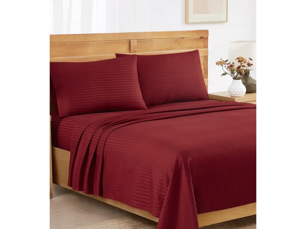 Experience the refined comfort and timeless elegance of the Royal Velvet Signature Dobby Stripe 100% Cotton Sheet Set, where luxury meets everyday living. Transform your bedroom into a sanctuary of luxury with these sheets. Designed to provide a royal look and a sumptuous feel, this bedding set features a sophisticated woven stripe pattern that adds a touch of elegance to any decor. The collection is available in a variety of rich solid colors, allowing you to effortlessly coordinate with your existing bedroom design. Crafted from 100% cotton with a 250 thread count, these sheets offer a perfect blend of softness and durability. The deep pocket fitted sheet is designed to accommodate mattresses up to 18 inches thick, with elastic on all four sides to ensure a secure, snug fit throughout the night. For over 60 years, Royal Velvet has been synonymous with modern classic designs that inspire creativity and self-expression. Known as the color authority, Royal Velvet delivers high-quality bedding that envelops you in comfort and style, making it the trusted brand to complete your bed in true luxury. Certified by OEKO-TEX Standard 100, this sheet set is produced with your well-being in mind, free from harmful substances and crafted responsibly.