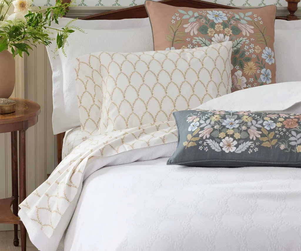 Arbors of delicate leaves arc across a solid ivory ground to create a pattern with a classic feel. Offered in your choice of two colorways, gold and blue, these sheets were created to layer with our other printed sateen bedding collections and coordinating Matelasse coverlet (sold separately). Crafted of buttery-soft and breathable sateen, this bedding collection has a subtle sheen and beautiful drape that's perfect for all-season comfort. Part of the Rifle Paper Co. x The Company Store collection.