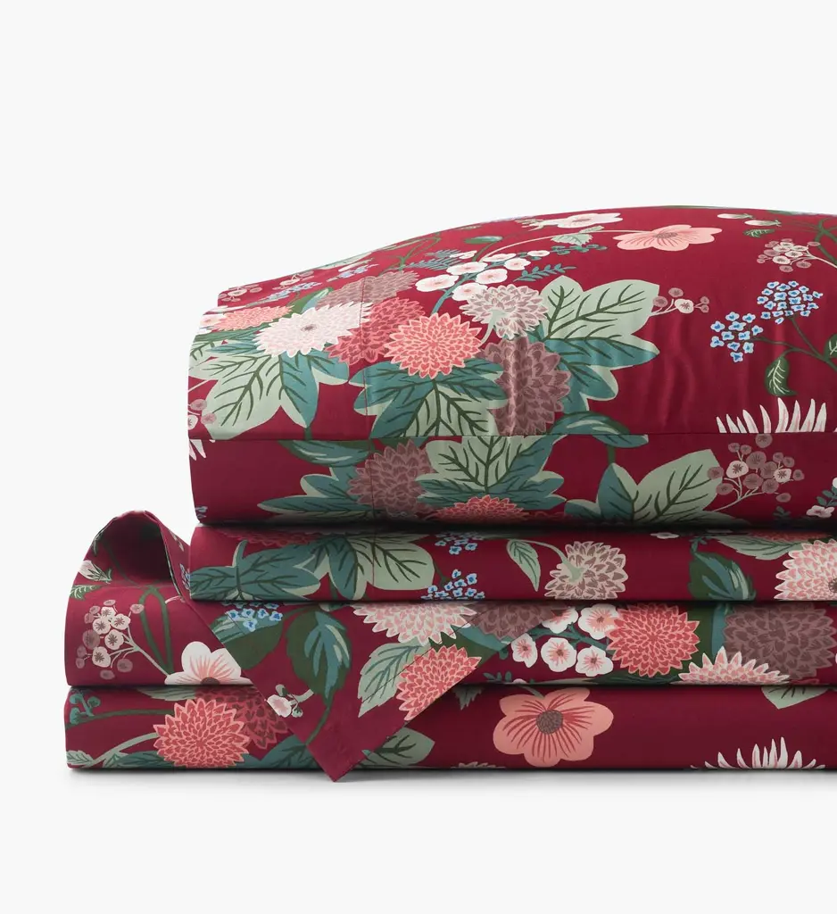A sheet set featuring a sophisticated scene of peacocks perched among winding branches and blooming flowers, designed to pair with the coordinating duvet cover, comforter , and accent pillows. Crafted of buttery-soft and breathable sateen, this bedding collection has a subtle sheen and beautiful drape that's perfect for all-season comfort. Part of the Rifle Paper Co. x The Company Store collection.