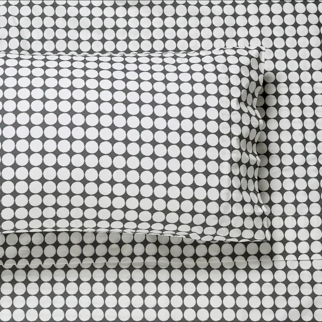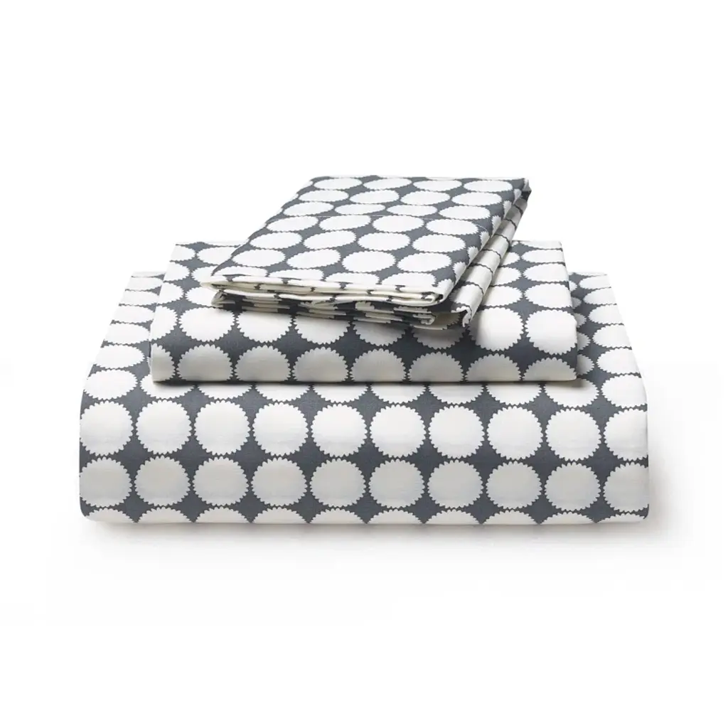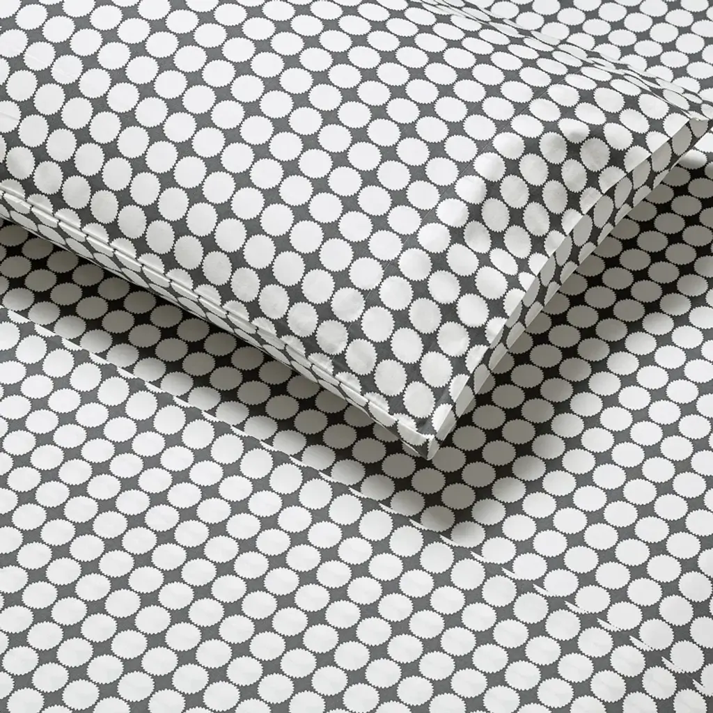 Elevate your sleep experience and cozy up with Sol Y Flor sheet set designed by Jungalow. This sheet set features a sun-inspired, geometric medallion print in a versatile dark gray and cream colorway. The 200 thread-count, cotton percale weave provides the perfect balance of comfort and durability. Full, Queen and King sets include a flat sheet, fitted sheet and 2 pillowcases; Twin set has one pillowcase.