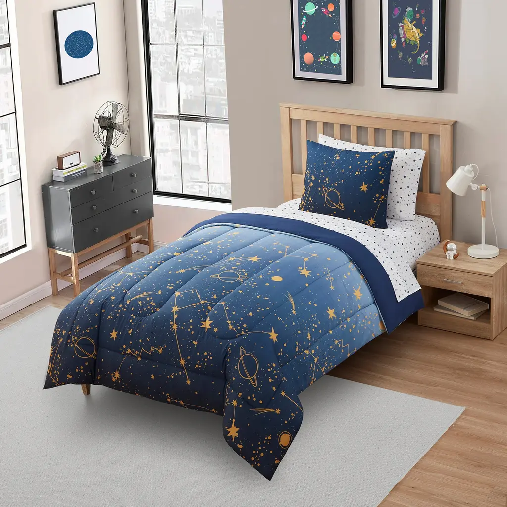 Delight a child who dreams of a future as an astronaut with this Spaceships sheet set. Satellites, planets, stars, and spacecrafts adorn these soft microfiber sheets for an exciting look in an astronomy-themed bedroom. The 14-inch pockets on the fitted sheet accommodate deeper mattresses.Kids printed sheet setPatternedSuper Soft Double Brushed MicrofiberTwin and Twin XL Have 1 Pillowcase, Full size has 2 PillowcasesMachine washable, Wrinkle resistant14 inch deep pocketFully Elasticized Fitted Sheet with No Slip Elastic Corner StrapsDimensionsTwin: (1)fitted 75"Lx39"W (1)flat 96"Lx66"W (1)pillowcase 20"Lx30"WTwin XL: (1)fitted 80"Lx39"W (1)flat 102"Lx66"W (1)pillowcase 20"Lx30"WFull: (1)fitted 75"Lx54"W (1)flat 96"Lx81"W (2)pillowcases 20"Lx30"W"