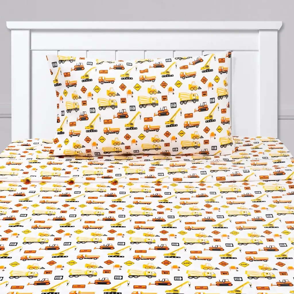 Combine playtime and bedtime with this Construction Zone sheet set! Kids will be excited to decorate their room with these sheets that are sure to dress up any bedroom dcor. This sheet set features an absolutely adorable construction site design. Sure to bring sweet dreams and endless smiles. At Sunny Side Up, our collection of bedding radiates sunshine and positivity. We believe in adding a touch of brightness to every bedroom! To clean machine wash cold. Dry on low.