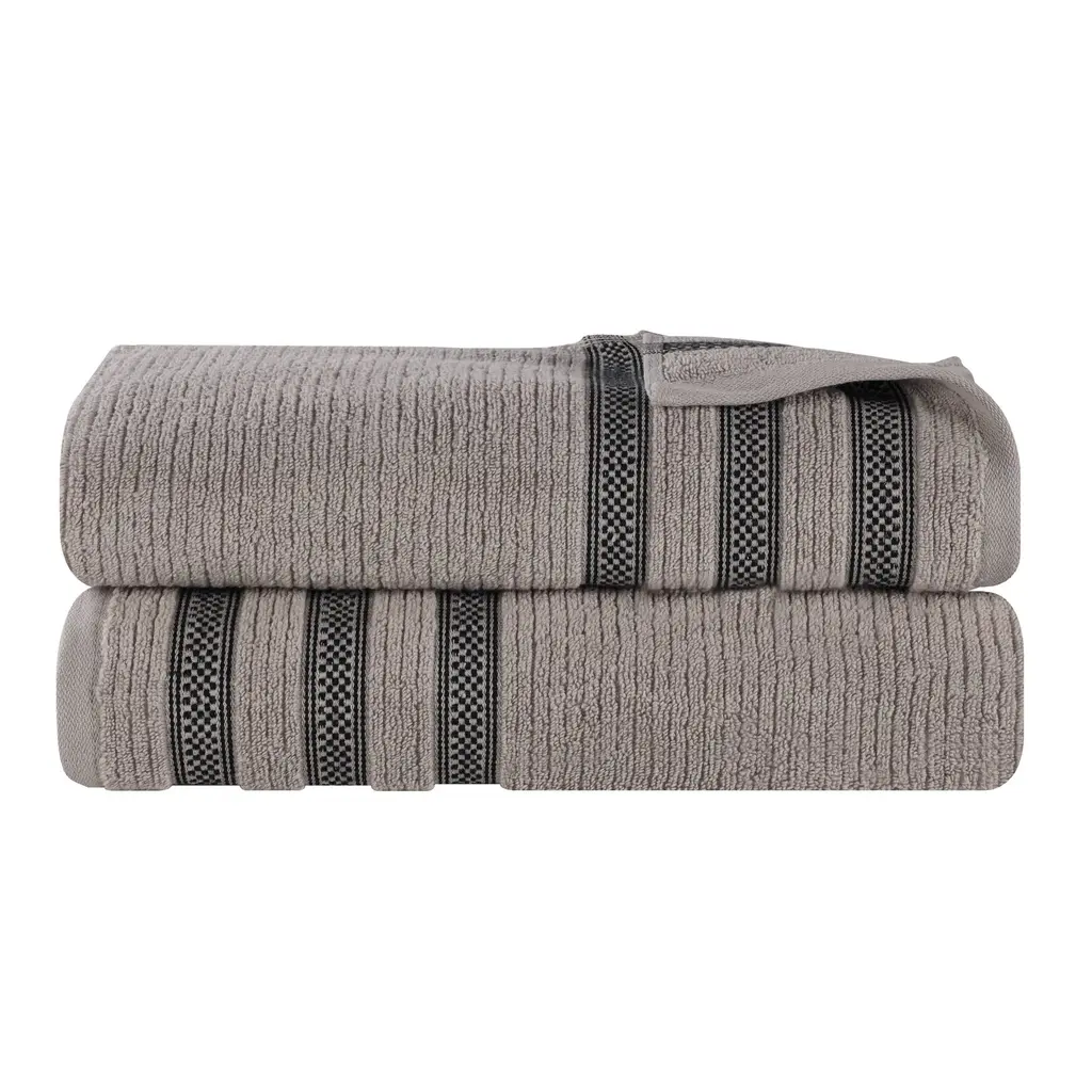 Embrace the soothing texture and spa-like quality of the Superior Brea Zero Twist Cotton Ribbed Modern Bath Sheet Set. Our zero twist cotton bath sheets are luxuriously soft and plush with a smooth design, ideal for people with sensitive skin. The comfortable single-ply thickness of each bath sheet provides versatile absorption, perfect for the bath, poolside, or at the beach. Featuring an absorbent ribbed texture with a stylish geometric border, these elegant oversized towels are available in Gold, Rust, Stone, Black, White, Ivory, Grey, Forest Green, and navy blue color options to match your bathroom decor style. This bathroom essentials set includes 2 bath sheets to wrap yourself in luxury comfort every day. Features: