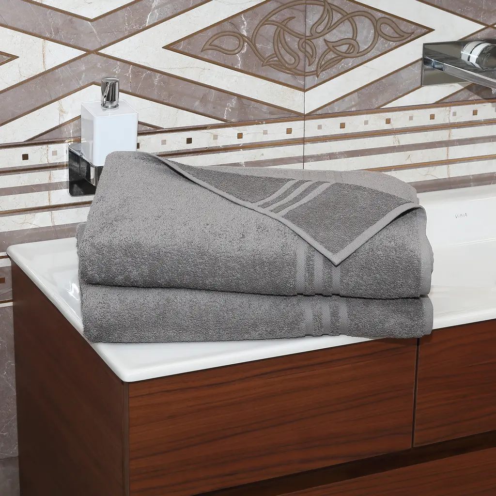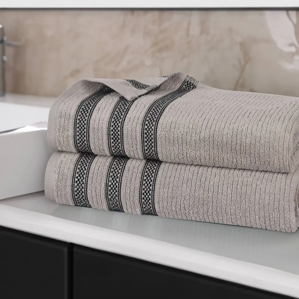 Embrace the soothing texture and spa-like quality of the Superior Brea Zero Twist Cotton Ribbed Modern Bath Sheet Set. Our zero twist cotton bath sheets are luxuriously soft and plush with a smooth design, ideal for people with sensitive skin. The comfortable single-ply thickness of each bath sheet provides versatile absorption, perfect for the bath, poolside, or at the beach. Featuring an absorbent ribbed texture with a stylish geometric border, these elegant oversized towels are available in Gold, Rust, Stone, Black, White, Ivory, Grey, Forest Green, and navy blue color options to match your bathroom decor style. This bathroom essentials set includes 2 bath sheets to wrap yourself in luxury comfort every day. Features:
