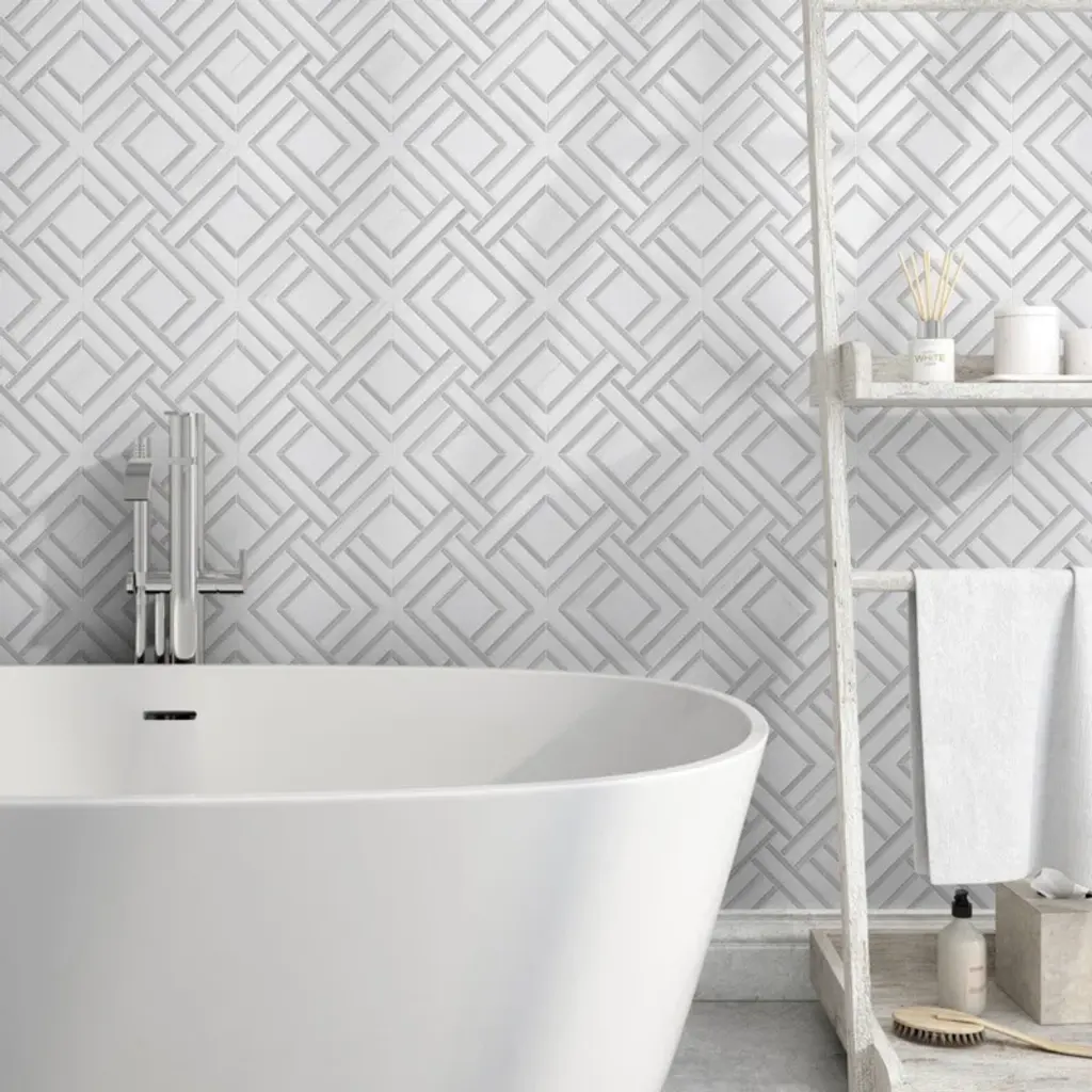 Color: Thassos White and White Carrara Overall Product Weight: 4.5 lb. Dimensions Mosaic Sheet: 13.25'' W X 11.75'' L Individual Tile: Multi Sizes Overall Thickness: 0.375 Surface Area per Carton: 5 SqFt Mesh-Mounted Tiles Installation Area: Kitchen Backsplash, Fireplace Front, Bathroom Wall, Shower Wall, Bathroom Floor, Shower Floor