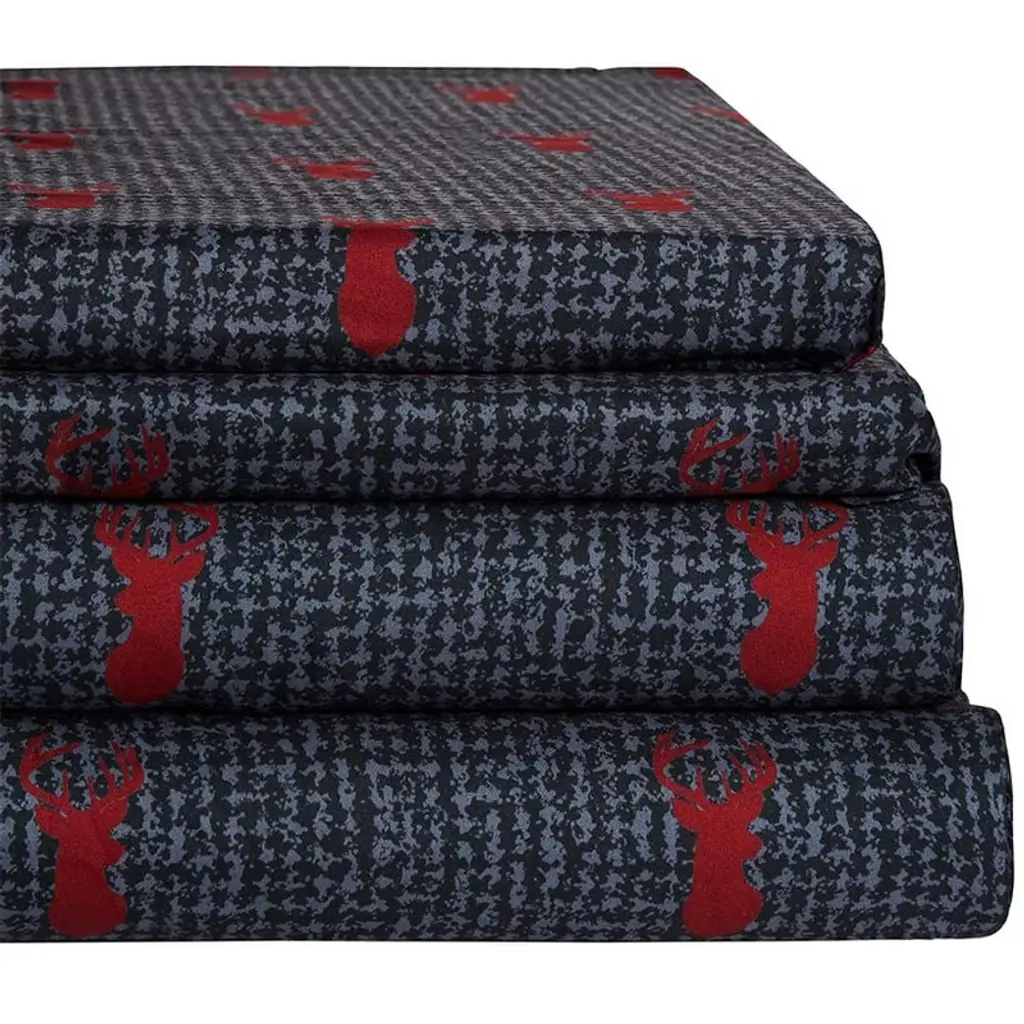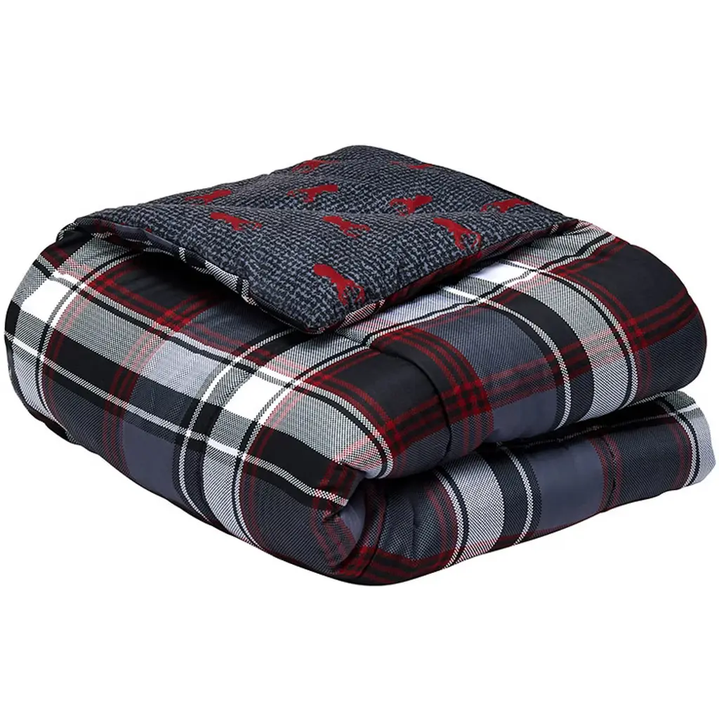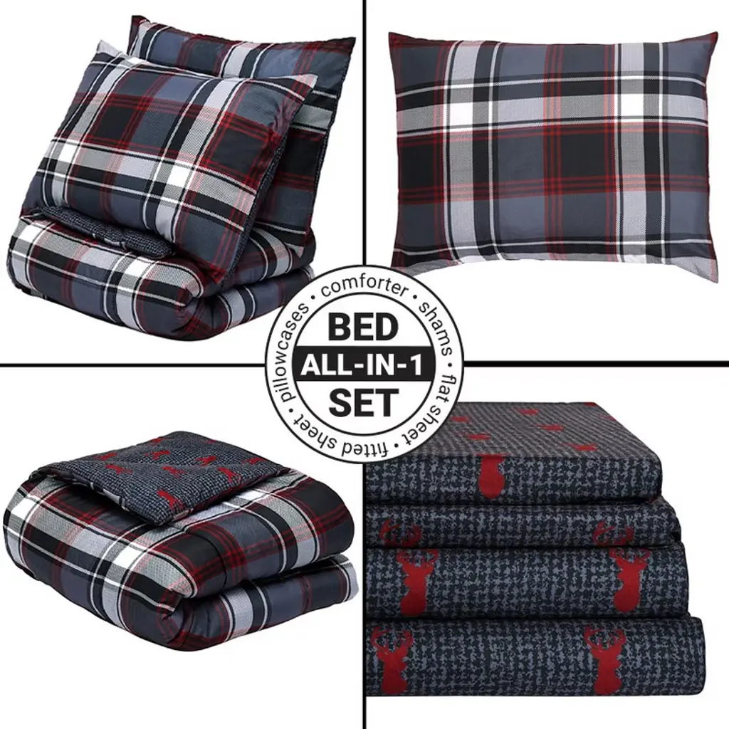 The Liam Plaid Complete Comforter Set with Sheets is the perfect touch of cabin style for any home. The comforters reverse from the mixed-plaid pattern to a red-and-black deer print. Plaid patchwork shams coordinate with both sides.
