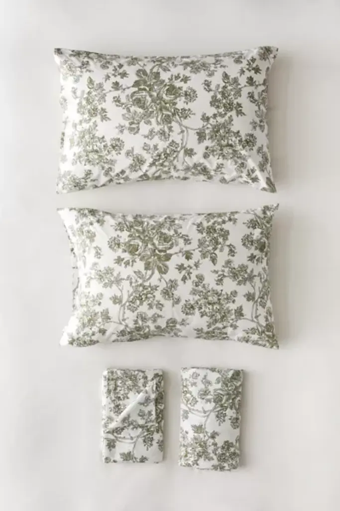 Bring vintage aesthetics to your dreams when you slip between this floral toile printed sheet set. These bed sheets come with everything you need to dress up your bed - a fitted sheet, flat sheet and pillowcases, too! Available exclusively at Urban Outfitters. **Features** \- Printed sheet set from UO Home in crisp cotton \- Includes all you need to make your bed \- An eco-friendly upgrade, this item is OEKO-TEX® Standard 100 certified free of harsh chemicals \- UO exclusive **Content + Care** \- Pillow inserts sold separately \- Twin XL sheet set includes pillowcase, flat sheet and a fitted sheet \- Full, Queen and King sheet sets include 2 pillowcases, flat sheet and a fitted sheet \- 80% Cotton, 20% polyester \- OEKO-TEX® Standard 100 Cert #: 11-47893 \- Meets OEKO-TEX® Standard 100 guidelines which independently test each component for harmful substances for textiles you can trust \- Machine wash \- Imported **Size** Twin XL \- Pillowcase dimensions: 20"l x 30"w \- Flat sheet dimensions: 101"l x 66"w \- Fitted sheet dimensions: 80"l x 39"w x 15"h Full \- Pillowcase dimensions: 20"l x 30"w \- Flat sheet dimensions: 96"l x 81"w \- Fitted sheet dimensions: 75"l x 54"w x 15"h Queen \- Pillowcase dimensions: 20"l x 30"w \- Flat sheet dimensions: 102"l x 90"w \- Fitted sheet dimensions: 60"l x 80"w x 15"h King \- Pillowcase dimensions: 20"l x 36"w \- Flat sheet dimensions: 102"l x 108"w \- Fitted sheet dimensions: 78"l x 80"w x 15"h