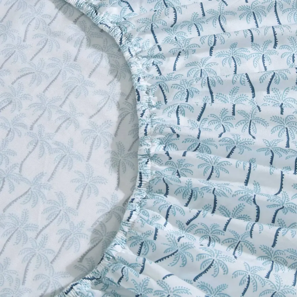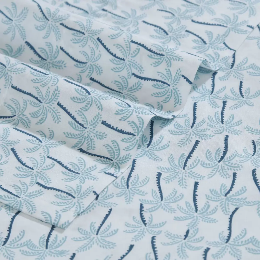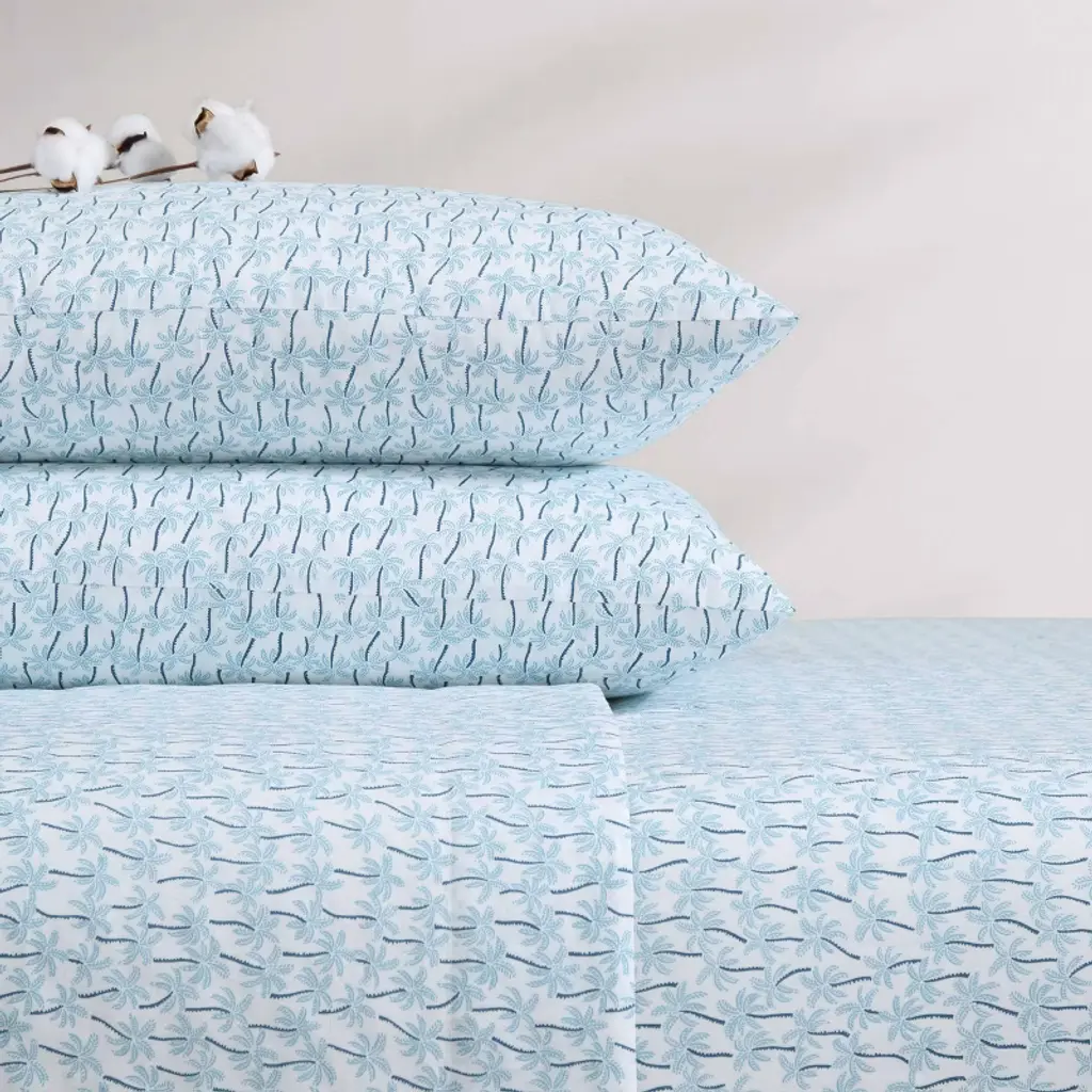 Transform your bedroom décor with the Palmtastic printed sheet set from Tommy Bahama. With a playful dash of tropical flair these sheet sets are designed for effortless layering with your favorite bedding, offering both style and comfort. Crafted from high-quality cotton, they boast a crisp and breathable feel, ensuring you enjoy a restful night's sleep. Complete the coastal vibe by pairing these sheets with a Tommy Bahama comforter set or décorative pillows, bringing the essence of palm trees swaying in a tropical breeze right into your home. With a deep-pocket fitted sheet that accommodates mattresses up to 18" deep, this set includes one flat sheet, one fitted sheet, and two pillowcases, providing everything you need for a cozy retreat. Plus, they're machine washable for easy and convenient care, promising enduring beauty and comfort.