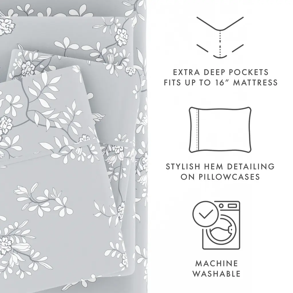 Our double-brushed patterned microfiber sheet set is super soft to the touch and wrinkle-resistant. We use premium yarns that are twice as durable as cotton, which means less risk of rips and wear. Naturally hypoallergenic, our sheets are ideal for sensitive skin and those with allergies. Available in a variety of unique designer prints and patterns, including florals, geometrics, and stripes, making it the perfect new addition to your room!