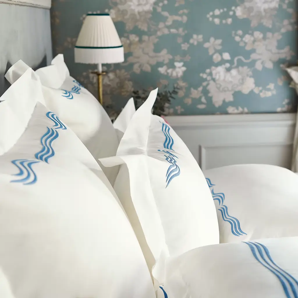 Imagine a soothing mix of a tranquil blue sky and a glimpse of Mediterranean. An island that seems hand-painted and carefully placed on the horizon. "Tuffo" is a simple dive in the allure of Tuscany. Threads are made of super-fine gauge fibers woven into a crisp yet extremely soft product. Verderoccia sheets are made to dive in, sleeping is optional. A signature embroidery on the new Estremo percale, Made in Italy. One top sheet, one fitted bottom, two standard shams. Customizable upon request.