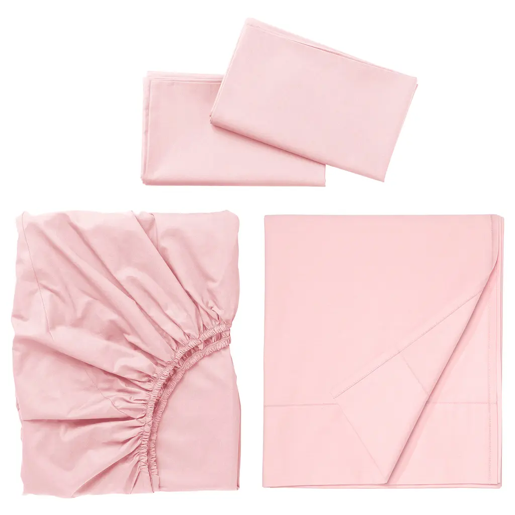 ULLVIDE Sheet set - light pink Full/Double. The tight percale weave makes the fabric very durable and resistant to pilling. It has a matte surface and is wonderfully crisp, soft and cool to sleep in. A set with a sheet, fitted sheet and pillowcases. 200 thread count.