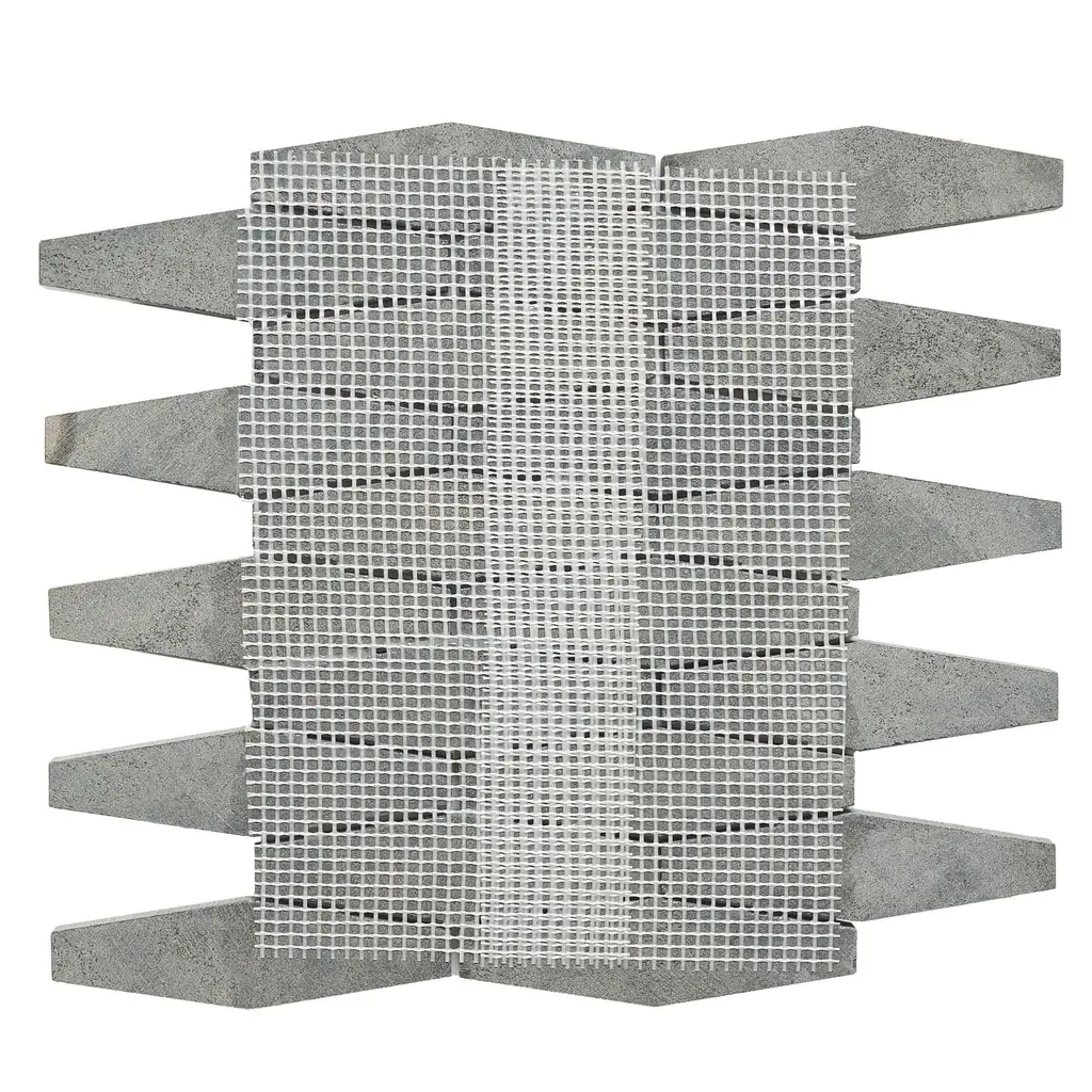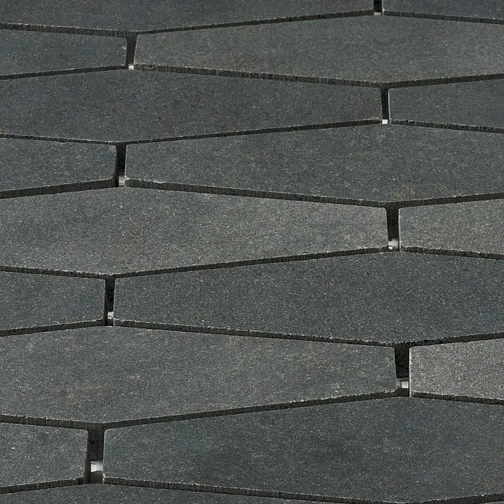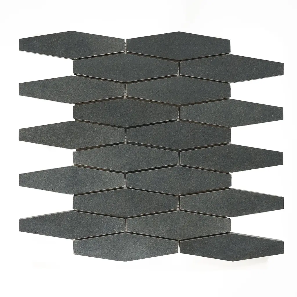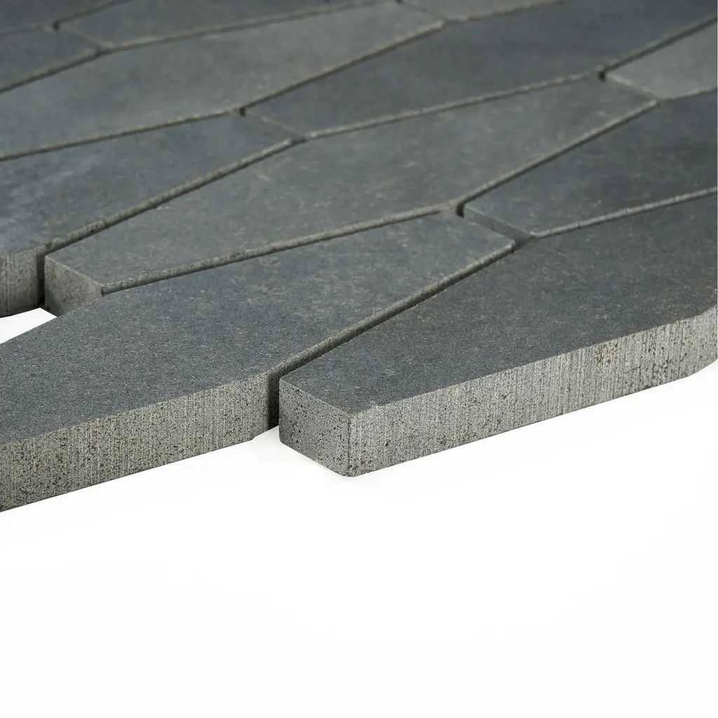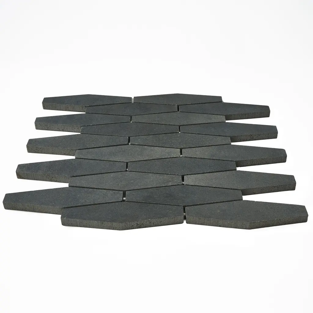 Vulcan Black Clipped Diamond Mosaic Tile is a type of natural stone tile that is made from volcanic basalt. It features a unique diamond shape with clipped corners, creating a distinctive and modern look. The tile is cut into small diamond-shaped pieces and arranged on a mesh backing to create a mosaic pattern. The honed finish provides a smooth and matte surface with a low sheen. The color of the tile is a dark grey with subtle variations and speckles, which gives it a natural and organic look. The volcanic basalt material makes it durable and resistant to wear and tear, making it suitable for a variety of applications such as flooring, walls, backsplashes, and accent pieces in both indoor and outdoor spaces. The clipped diamond shape adds a unique and stylish touch to any design, making it a popular choice for modern and contemporary spaces.What's included?Product Details Sample Details