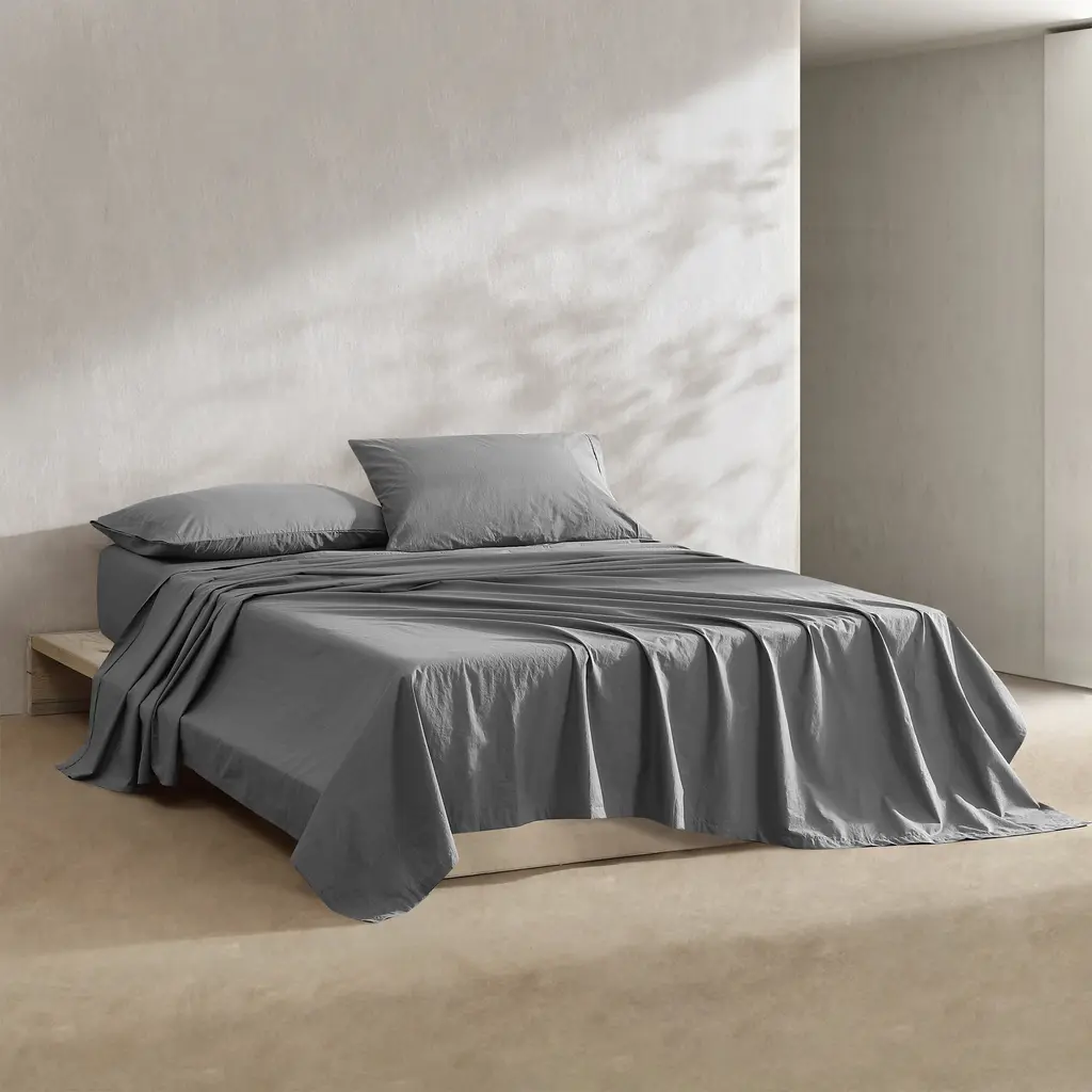 The Calvin Klein washed percale collection is available in sheet sets, duvet sets, and comforter sets for a modern monochromatic bed. Crafted from 200-thread count cotton percale and garment washed, it feels super soft and relaxed.