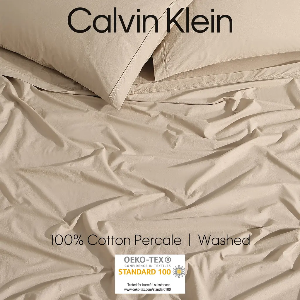 The Calvin Klein washed percale collection is available in sheet sets, duvet sets, and comforter sets for a modern monochromatic bed. Crafted from 200-thread count cotton percale and garment washed, it feels super soft and relaxed.