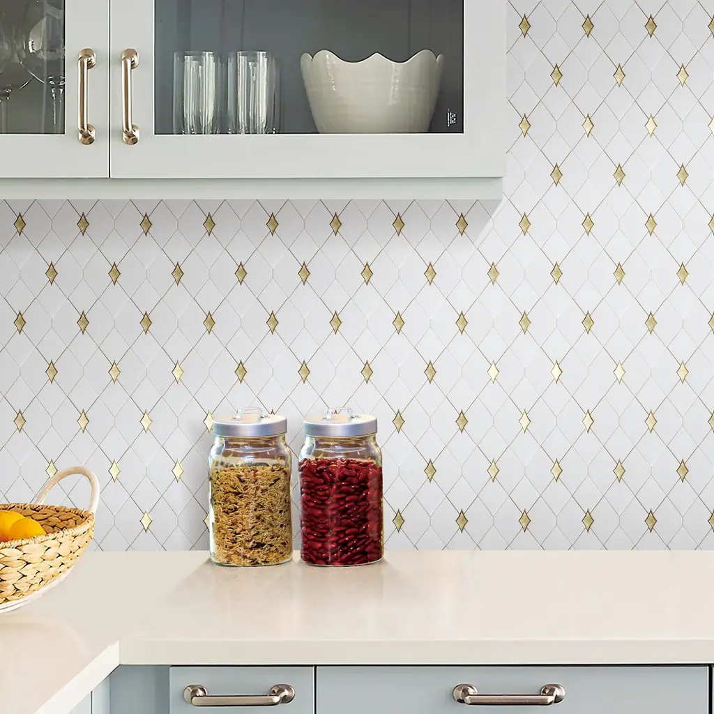 Color: Thassos White & Gold Glass Overall Product Weight: 3.08 lb. Dimensions Mosaic Sheet: 10.88'' W X 13.25'' L Individual Tile: Multi Overall Thickness: 0.3 Finish: PolishedSurface Area per Carton: 9 SqFt It is mesh-mounted for easy installation. Installation Area: Kitchen Backsplash, Fireplace Front, Bathroom Wall, Shower Wall