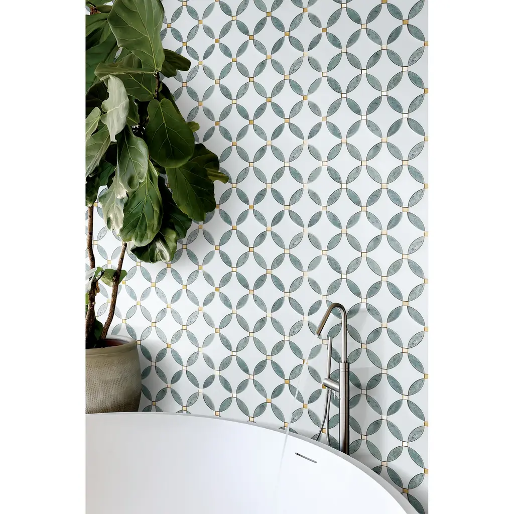 Color: Thassos White, Jade Marble and Gold Metal Overall Product Weight: 4.18 lb. Dimensions Mosaic Sheet: 14.13'' W X 13'' L Individual Tile: 5'' W X 5'' L (Each Pattern)Finish: PolishedOverall Thickness: 0.3 Surface Area per Carton: 10 SqFt It is mesh-mounted for easy installation. Installation Area: Kitchen Backsplash, Fireplace Front, Bathroom Wall, Shower Wall