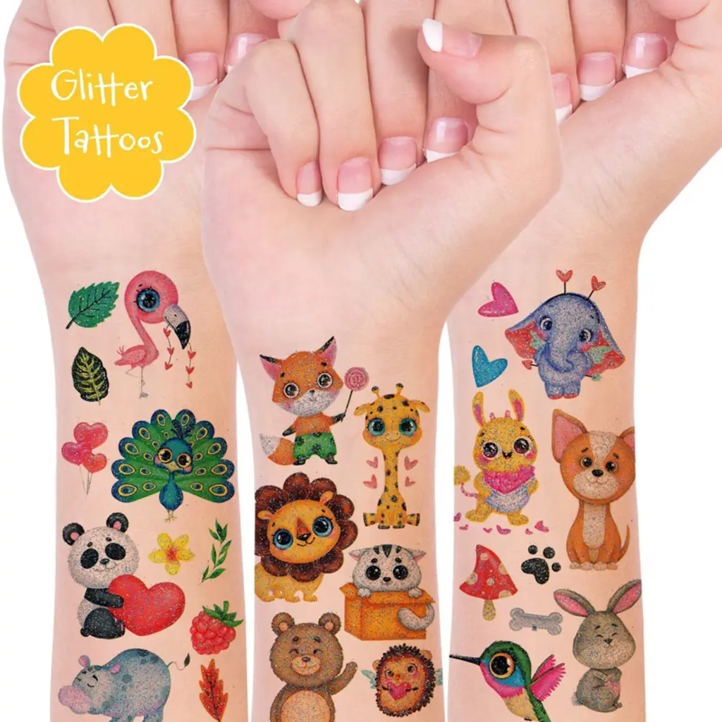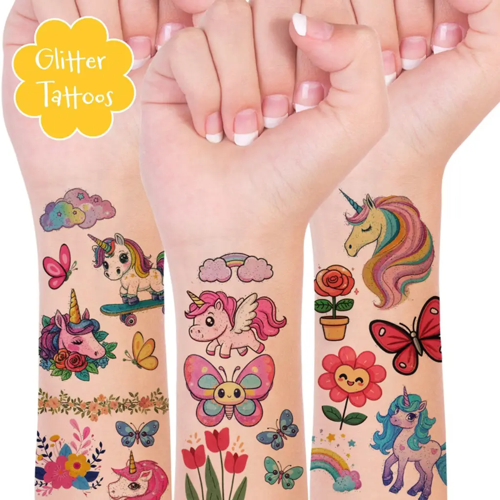 Add some sparkle to every celebration with these Waterproof Glitter Temporary Tattoos, a dazzling addition to party favors, goodie bags, and holiday treats. Each set includes several sheets of fun-themed designs, all bursting with shimmering glitter for an extra eye-catching pop. Whether you’re prepping for a birthday bash or planning festive handouts for Halloween, Christmas, or Easter, these sparkling tattoos make every moment a little more magical. Ideal as party favors, stocking stuffers, trick-or-treat handouts, Easter egg hunt prizes, or rewards, these glitter tattoos are sure to delight. Sparkling Glitter Designs: Each set includes several sheets of vibrant temporary tattoos enhanced with eye-catching glitter for extra sparkle and fun. Perfect Party Favors: Great for birthday parties, goodie bags, and party favors. Also ideal for seasonal celebrations like Halloween trick-or-treating, Christmas stocking stuffers, Easter egg hunts, and rewards.Easy to Apply & Remove: Simply cut out the desired tattoo, place face down on skin, wet with a sponge or cloth, and peel after 30 seconds. Removes easily with baby oil, rubbing alcohol, or soap and water.Waterproof & Sweat-Resistant: These glitter tattoos are designed to last even with water or sweat exposure.Recommended: Safe for kids ages 3 years and up (not recommended for children under 3 years old).