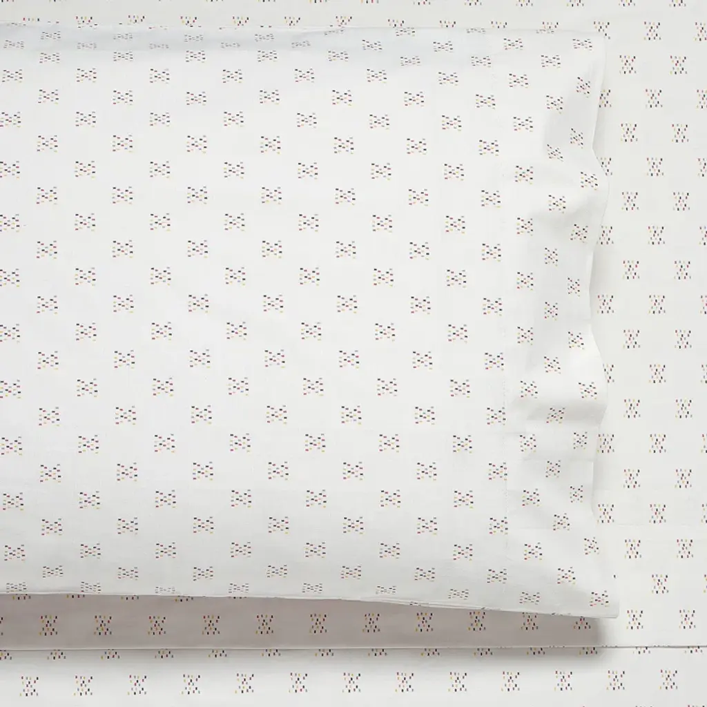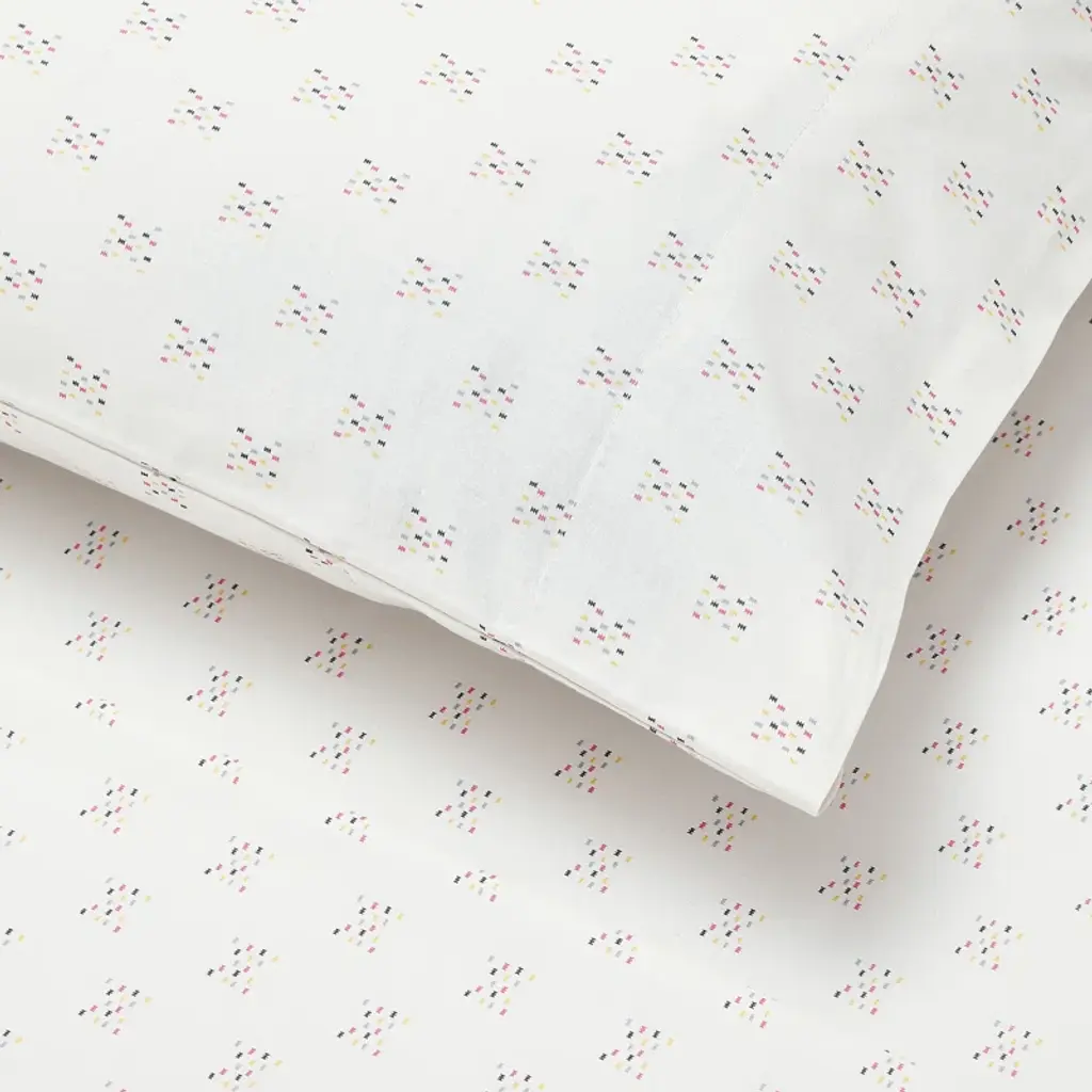 Elevate your sleep experience and cozy up with the Yaren sheet set designed by Jungalow. This sheet set features a small, multi-colored geometric design that adds subtle yet sophisticated charm. The 200-thread-count, cotton percale weave provides the perfect balance of comfort and durability. Full, queen, and king sets include a flat sheet, fitted sheet, and 2 pillowcases; twin set has one pillowcase.