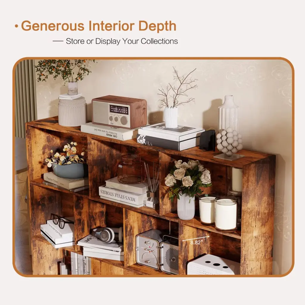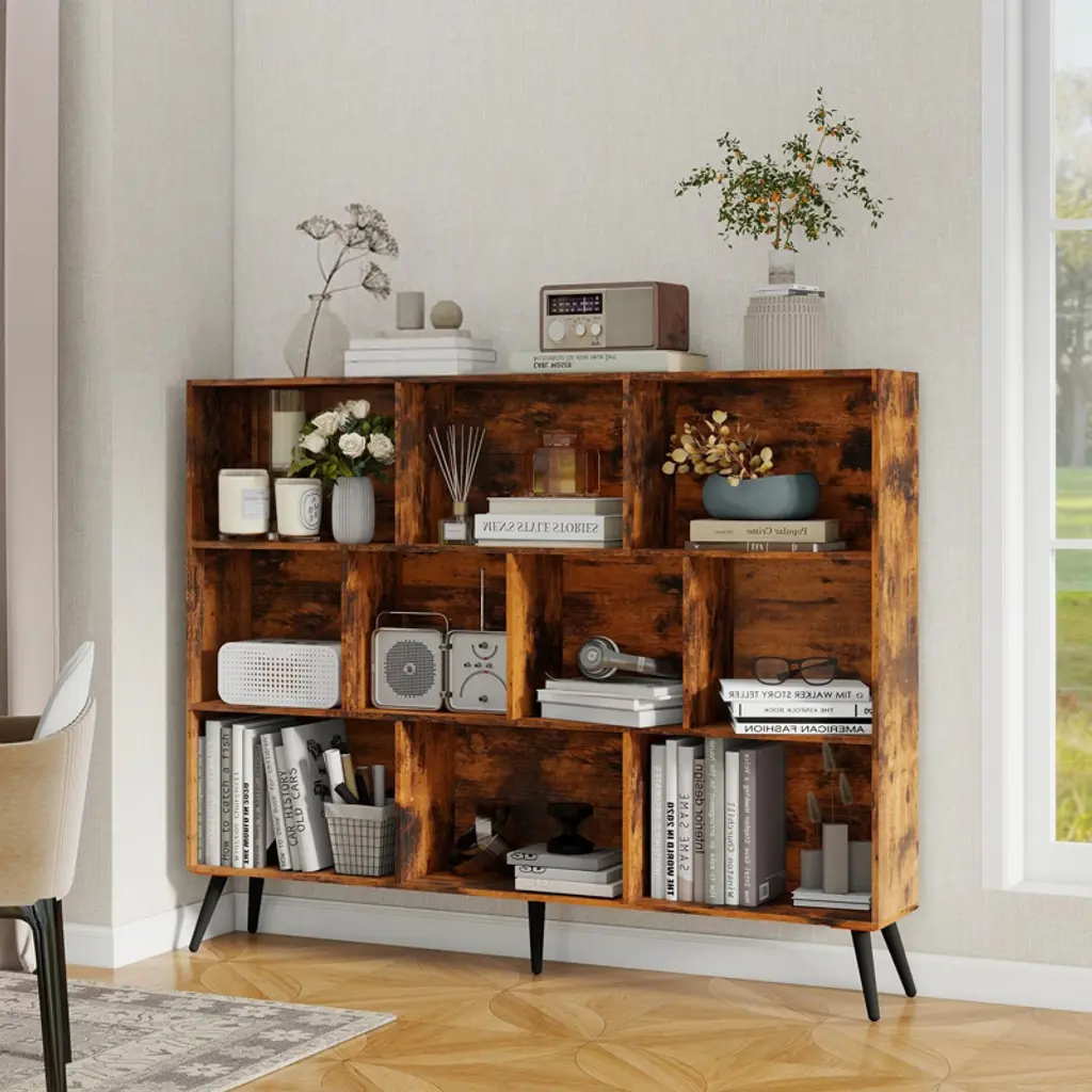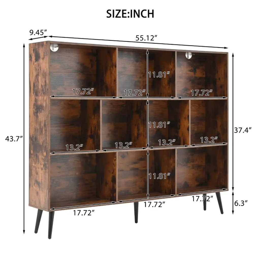 10 Cube Bookshelf, Wooden 3 Tier Bookcase With 5 Iron Legs, Freestanding Organizer Open Display Book Shelf,brown
