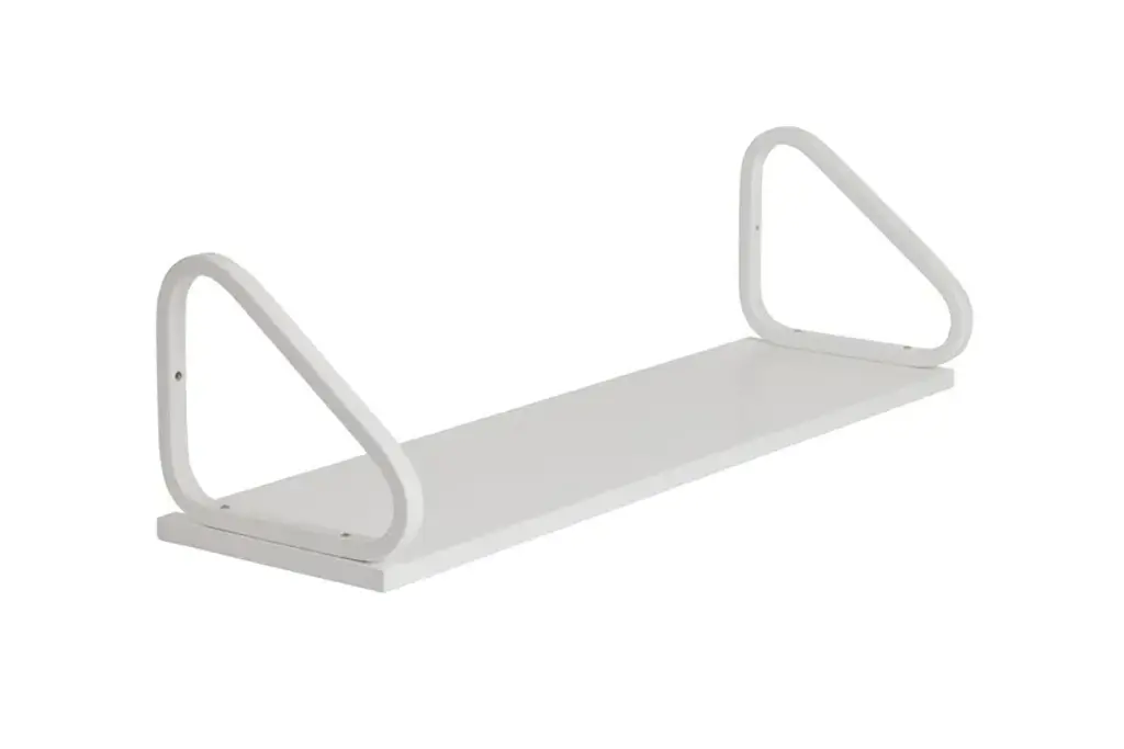 Wall Shelf 112 employs lamella loops as brackets to support a substantial birch veneer panel. The particular lamella loops used in the creation of Wall Shelf 112 require the strength of two people to bend them into shape and come with a single seam. The brackets can be placed both below and above the panel, in which case they also serve as bookends. Elegant and practical, this wall shelf displays designer Alvar Aalto’s affinity with natural materials.Brackets: Form-bent solid birch lamellaShelf core: Solid birch frame, birch plywood, honeycombShelf surface: Birch veneer natural, black or white