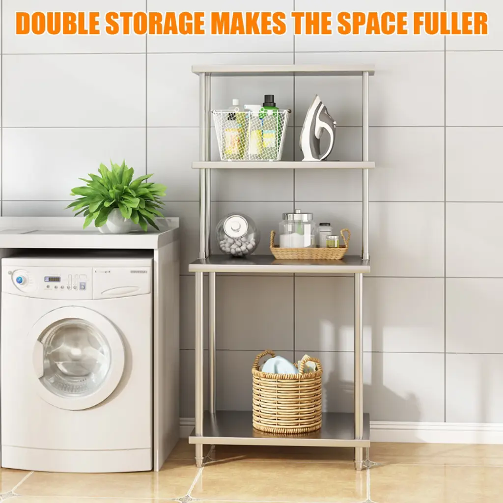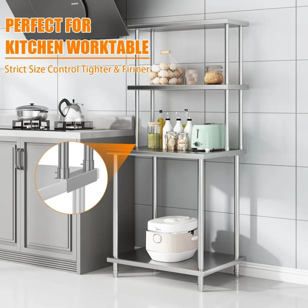 Product DescriptionThis 2-tier stainless steel overshelf is built from food-grade stainless steel with excellent resistance to rust, corrosion, and high temperatures, making it ideal for commercial kitchens and home use. Measuring 30" L × 12" W × 37" H, it offers a high load capacity—360 lbs on the top shelf and 220 lbs on the bottom—with an adjustable lower tier for flexible storage. Its polished finish adds a sleek look to restaurants, hotels, bars, garages, or workshops, while the easy assembly design with included hardware ensures a quick setup to maximize your workspace efficiency.Product InformationColor: SilverMaterial: Stainless SteelSize: 12x30/12x36/12x48/30x24/36x24/48x24inItem Weight: 16.31/18/22.33/30.86/32/40 PoundsCapacity: 360LbsProduct Dimensions: 12"D x 30"W x 37"H/12"D x 36"W x 37"H/12"D x 48"W x 37"H/32.28"D x 26.38"W x 5.31"H/36"D x 24"W x 55"H/ 48"D x 24"W x 55"HSpecial Feature: Heat ResistantNumber of Shelves: 2Room Type: KitchenAssembly Required: YesMounting Type: TabletopPacking List:1 x Stainless Steel Double Overshelf1 x Assembly Kit1 x User ManualFriendly Note:1. For your safety, it is recommended to wear gloves during the assembly process.2. Prior to placing any items on the overshelf, please verify that it is securely attached and stable to ensure optimal support and stability.