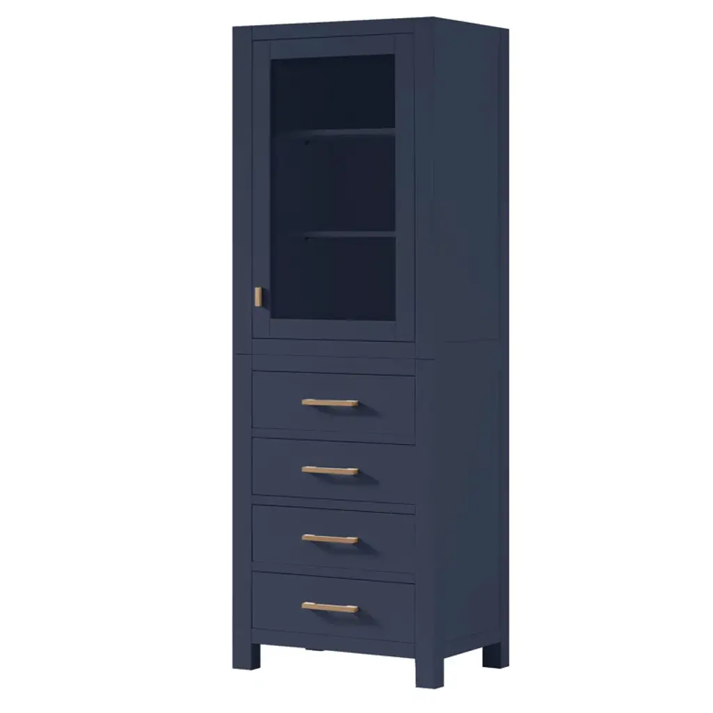 This narrow free-standing linen cabinet brings handy storage and a bit of vintage style to any bathroom in your coastal farmhouse. It's carefully crafted from water-resistant solid teak wood that we hand-picked for its sturdiness and ability to last for years to come (even in damp spaces). Its narrow 16"-wide design has four drawers and a glass cabinet door that opens to reveal shelves, giving you more than enough space to tidy up towels or any bathroom essentials you'd like out of sight. We love how its corner design allows you to put it wherever your heart desires, which we know you'll appreciate. And the best part of all? This linen tower arrives fully assembled in the color of your choice and doesn't require any installation, so you can start packing it with towels and linens as soon as it lands on your doorstep.