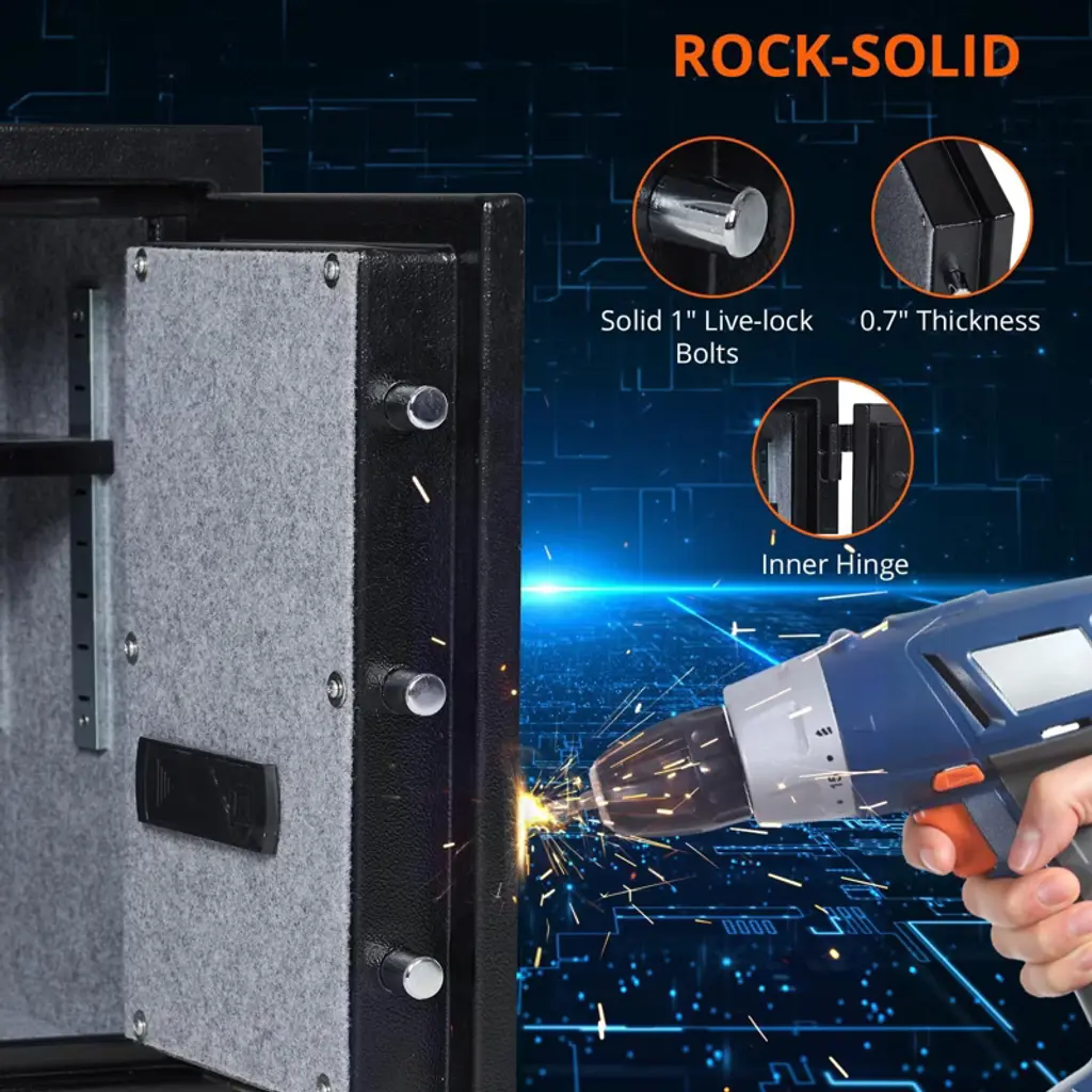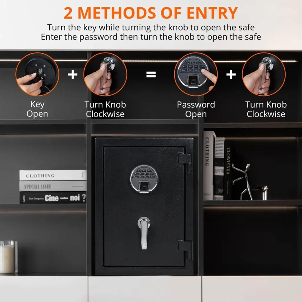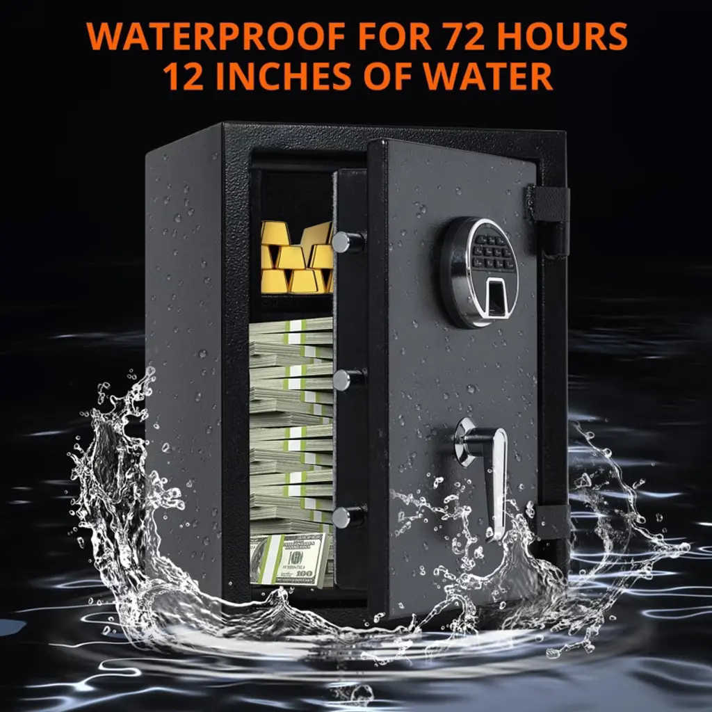 Protect your valuables with this 2 cu.ft fireproof & waterproof safe. Certified to withstand 1700¡ãF heat for 39 minutes and 72 hours of water immersion, it keeps cash, jewelry, firearms, and documents secure. Built with thick steel, 3 locking bolts, and hidden hinges for anti-pry defense. Features a digital keypad + fingerprint lock with emergency key backup, plus an inner lockbox and adjustable shelf for organized storage of laptops, medicine, and more.