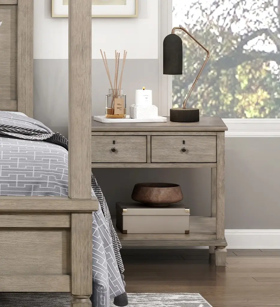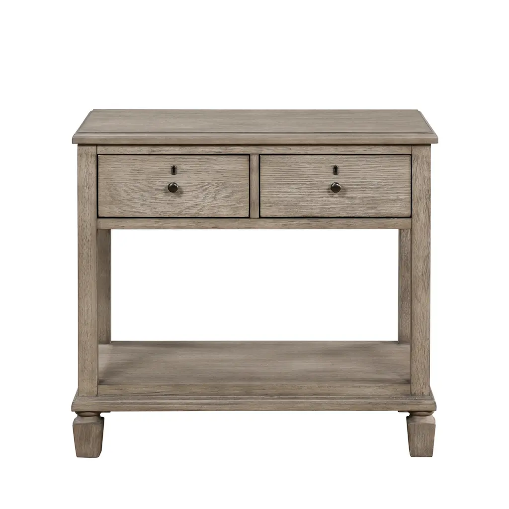 Transitional sensibility pairs with eye-catching elegance in the design of the Marceline Collection. The classically styled nightstand is a refined addition to the collection, its drawers each centered by knob hardware. Additional decorative touch comes in the form of keyhole accenting located above each drawer knob. The open design of the nightstand’s base allows for open display and storage. The oak veneer of the collection features a gray oak finish. PRODUCT DIMENSIONS: Overall Dimension: 32" x 18" x 29"H Drawer interior: 11.5" x 13" x 3.5"H(2) Shelf interior: 27" x 14" x 13.5"H Listing Includes: One Nightstand Only. Simple Assembly Require.