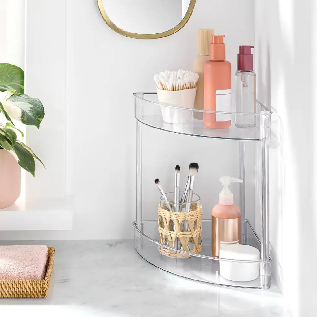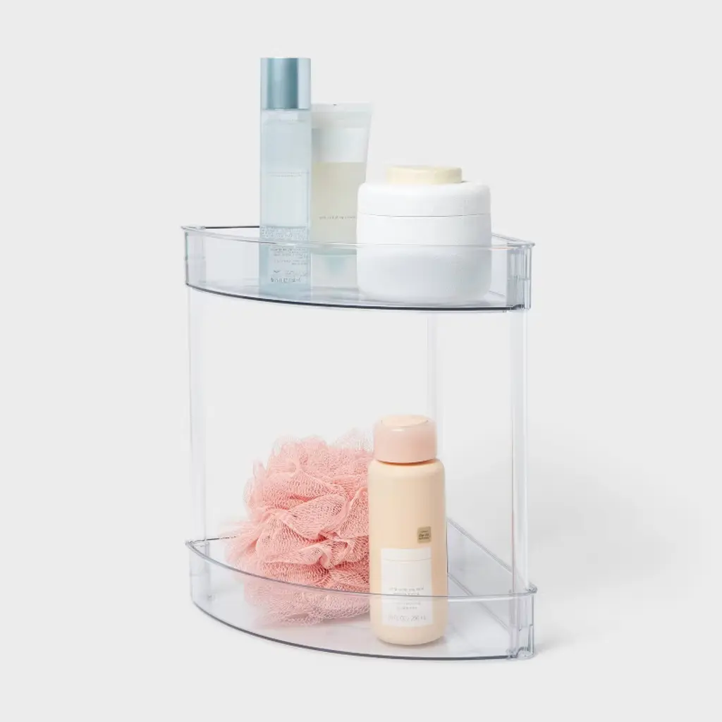 Maximize the corner space of your vanity with the 2 Tier Corner Shelf from Brightroom™. This clear shelf features a two-tiered design to give you ample space for cosmetics, skincare, bath canisters and more. Made of sturdy plastic, this corner shelf adds a fun addition to your bath space, vanity or any other area you'd like to have a bit more storage space.Brightroom™: See your space in a new light.