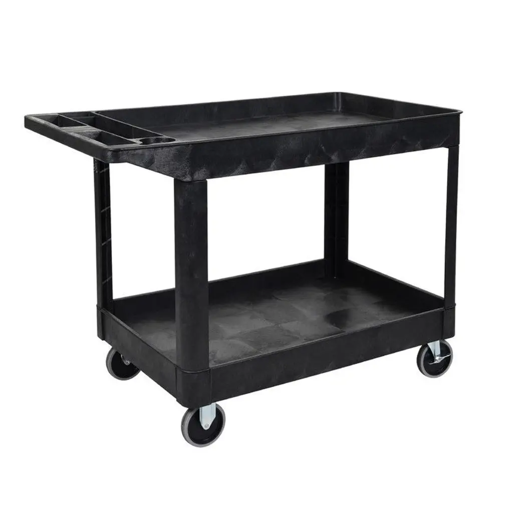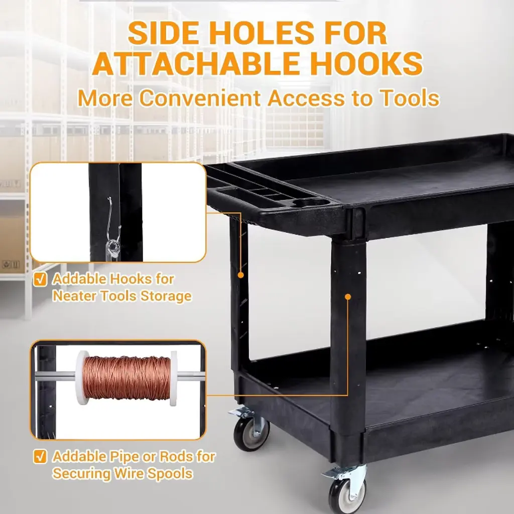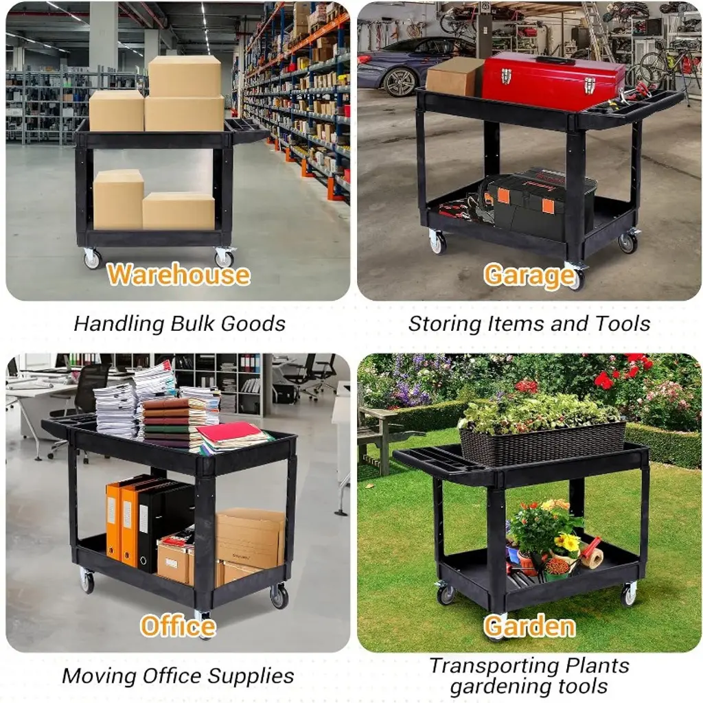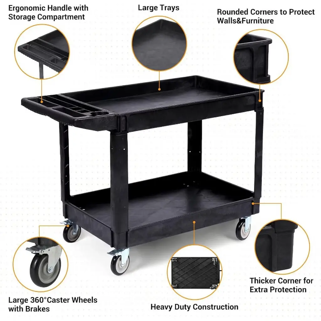 2 Tier Large Pp Service Cart, Rolling Utility Cart Shelf With 360°swivel Wheels, 550lbs, Storage Handle, For Warehouse/vegetables/cleaning, Black