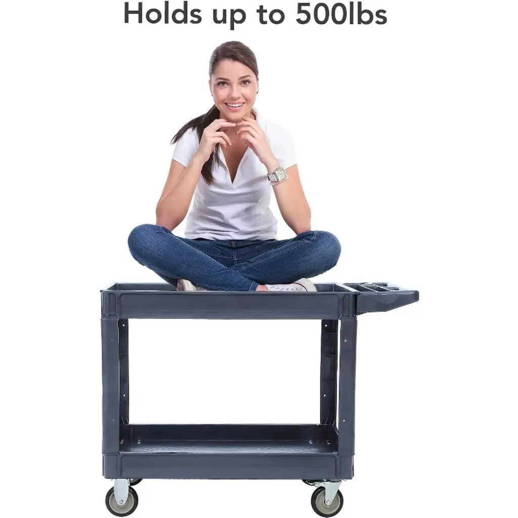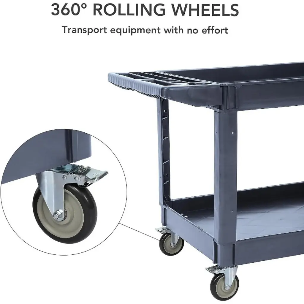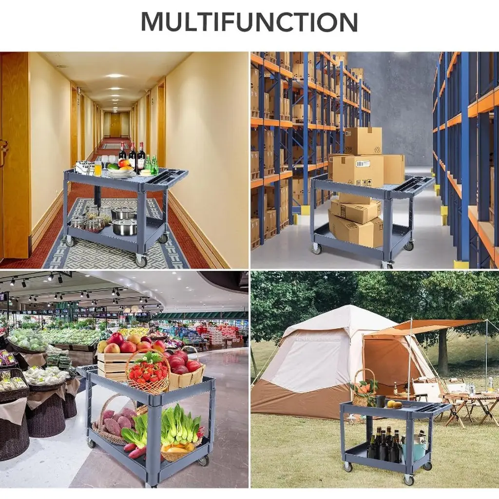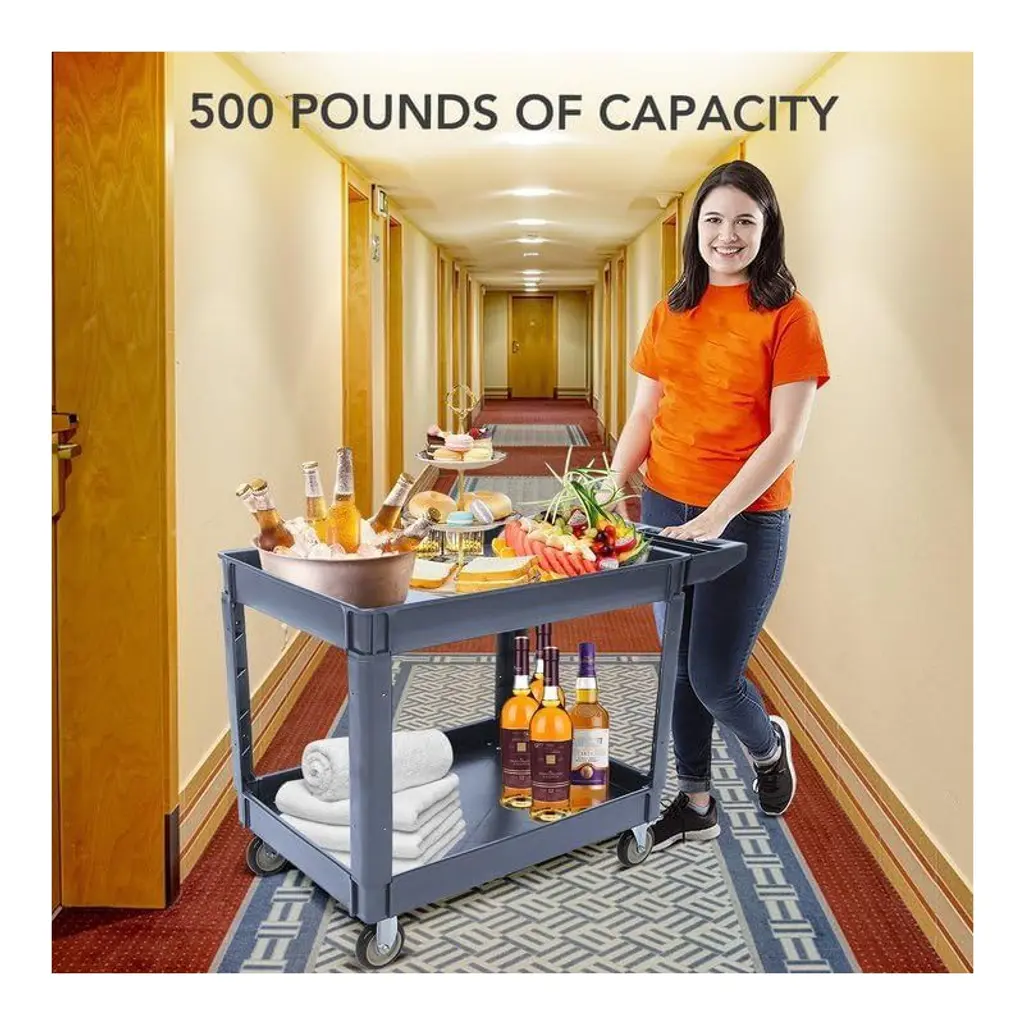 2 Tier Plastic Utility Cart With Wheels, 500lb Heavy Duty Rolling Deep Shelf Food Service Work Cart, Commercial Maintenance, Garages, Shops, Gray
