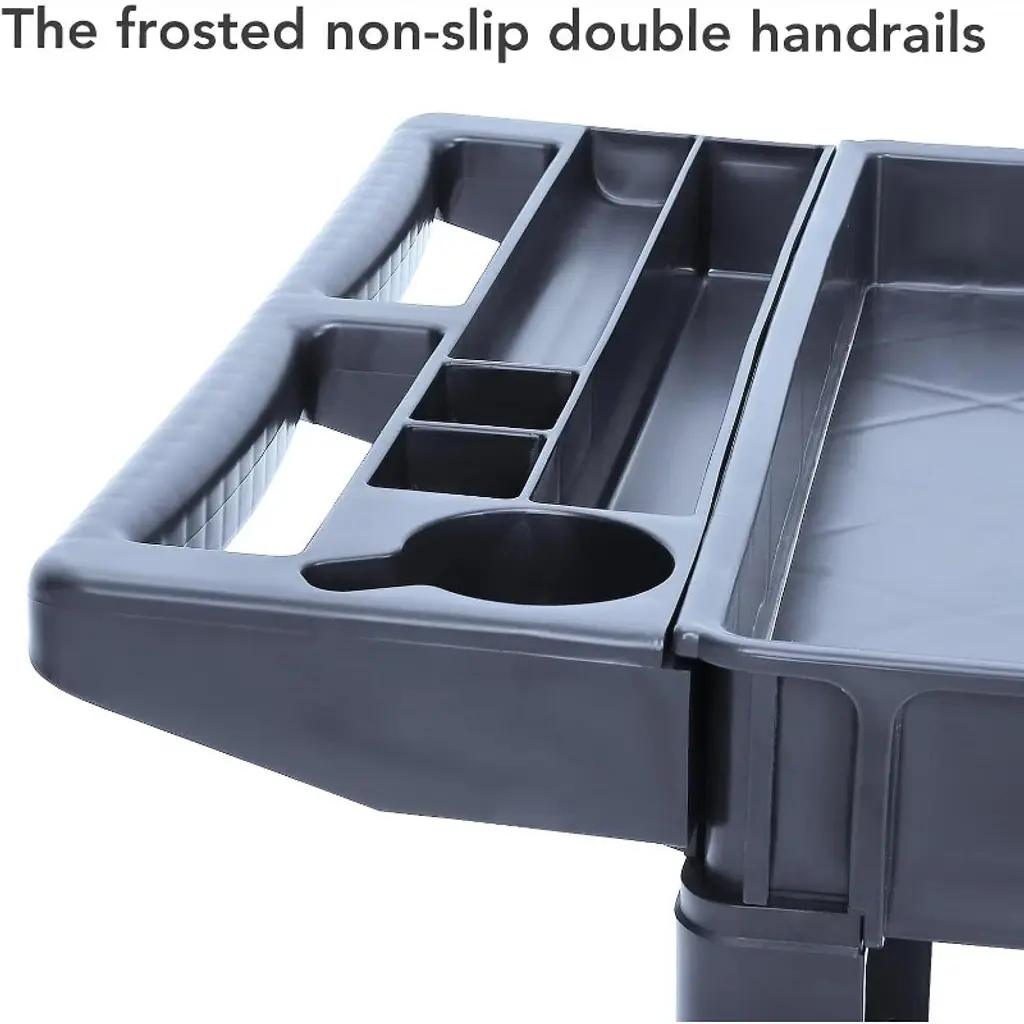 This service trolley with wheels is ideal for moving tasks due to its high load capacity and large capacity design. Ideal for transporting materials, items and heavy objects in almost any environment, the structural foam material is more durable than others, and with a total weight capacity of up to 500 lbs (250 lbs per tier), it can securely carry your lifting needs, making it a reliable companion on the job. Tray dimensions are 36.1 x 24.2 x 2.75 inches and exterior dimensions are 45.67 x 25.59 x 33.27 inches, 2.4 inches deep tray shelves ensure that items remain stable during movement, and the rounded corners design protects walls and furniture from collision damage, providing a safe and convenient use experience. Equipped with 5-inch industrial-grade polypropylene wheels for both smoothness and durability, the outer thermoplastic rubber package absorbs vibration, reduces noise, and prevents floor scratches and carpet obstructions, and performs well on tile, wood, smooth concrete, or carpet, providing a smooth moving experience. In addition to the ergonomic handle design, it is also equipped with grooves for water bottles and some tools, making it more convenient for you to work and handle your work items with ease, the thoughtful design helps to complete tasks efficiently, adding convenience and efficiency to your daily work. We provide 24 months warranty service to ensure your shopping is worry-free, if you encounter any problems in the process of use, please feel free to contact us, we will be happy to help you solve the problem, whether it is the quality of the product or the use of experience, we are committed to providing you with the best service, so that you can rest assured that you can use it and enjoy the convenience and peace of mind.