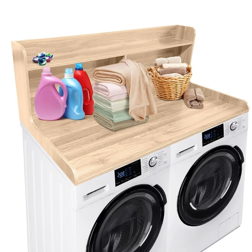 Maximize your laundry room with a 2 tier washer dryer countertop with shelf. Use the wide upper shelf for detergents or baskets and the spacious 54x27.5 inch topper for folding clothes, creating a clutter-free laundry counter over machines. Built with thick engineered wood and a waterproof coating, this laundry machine topper stands up to daily use, spills, and humidity. The durable surface keeps your washer and dryer topper looking new while supporting heavy laundry loads. Non slip rubber mats on the bottom keep your laundry topper firmly positioned, protecting machines from scratches and reducing movement. Organize and fold laundry with confidence on a stable, reliable washer dryer shelf. Raised 2.75 inch edge railings line the counter top for washer and dryer, preventing detergent, cleaning supplies, or folded clothes from slipping off. Enjoy peace of mind knowing your items stay safely in place during laundry tasks. Clear instructions and labeled parts ensure fast, hassle-free setup. Designed for most standard washers and dryers, this laundry room countertop fits a wide range of machines, so you can upgrade your laundry area with confidence.