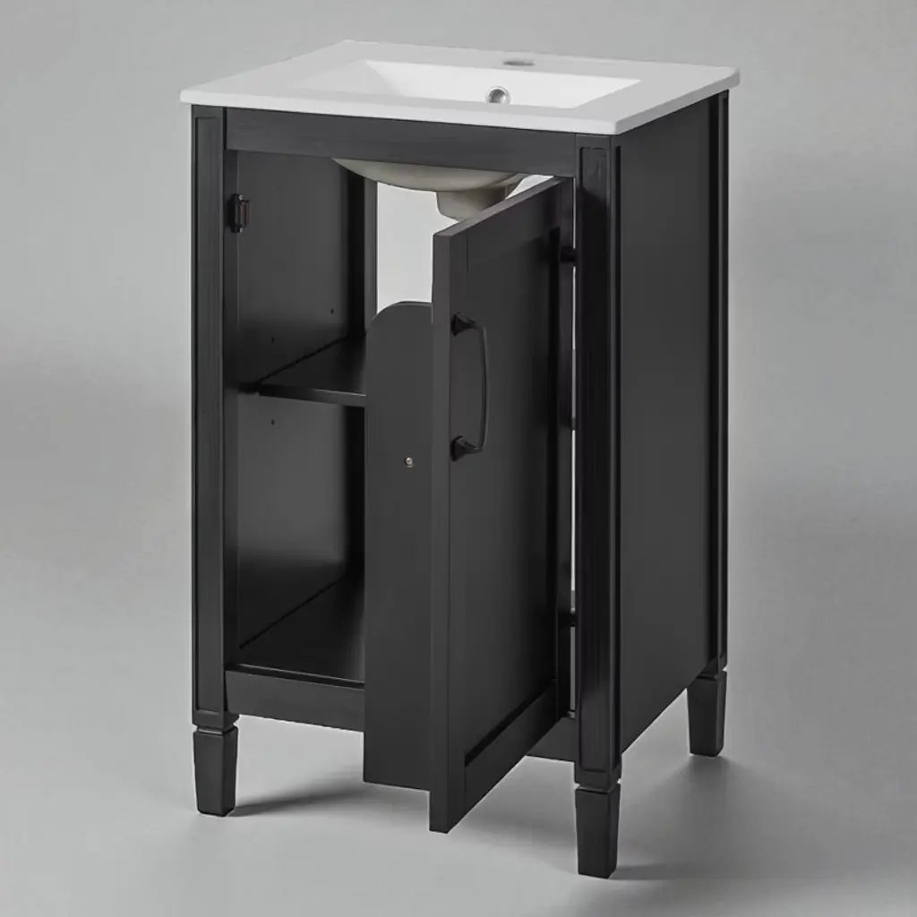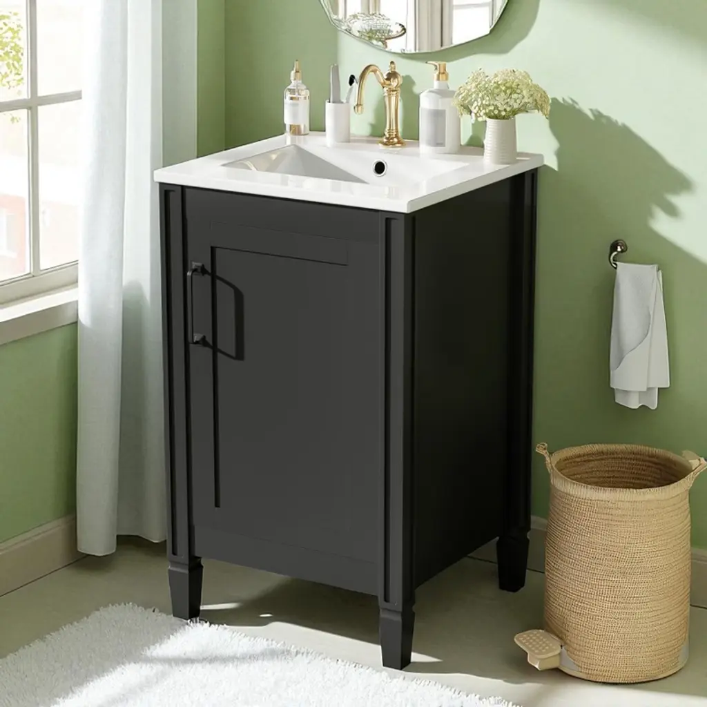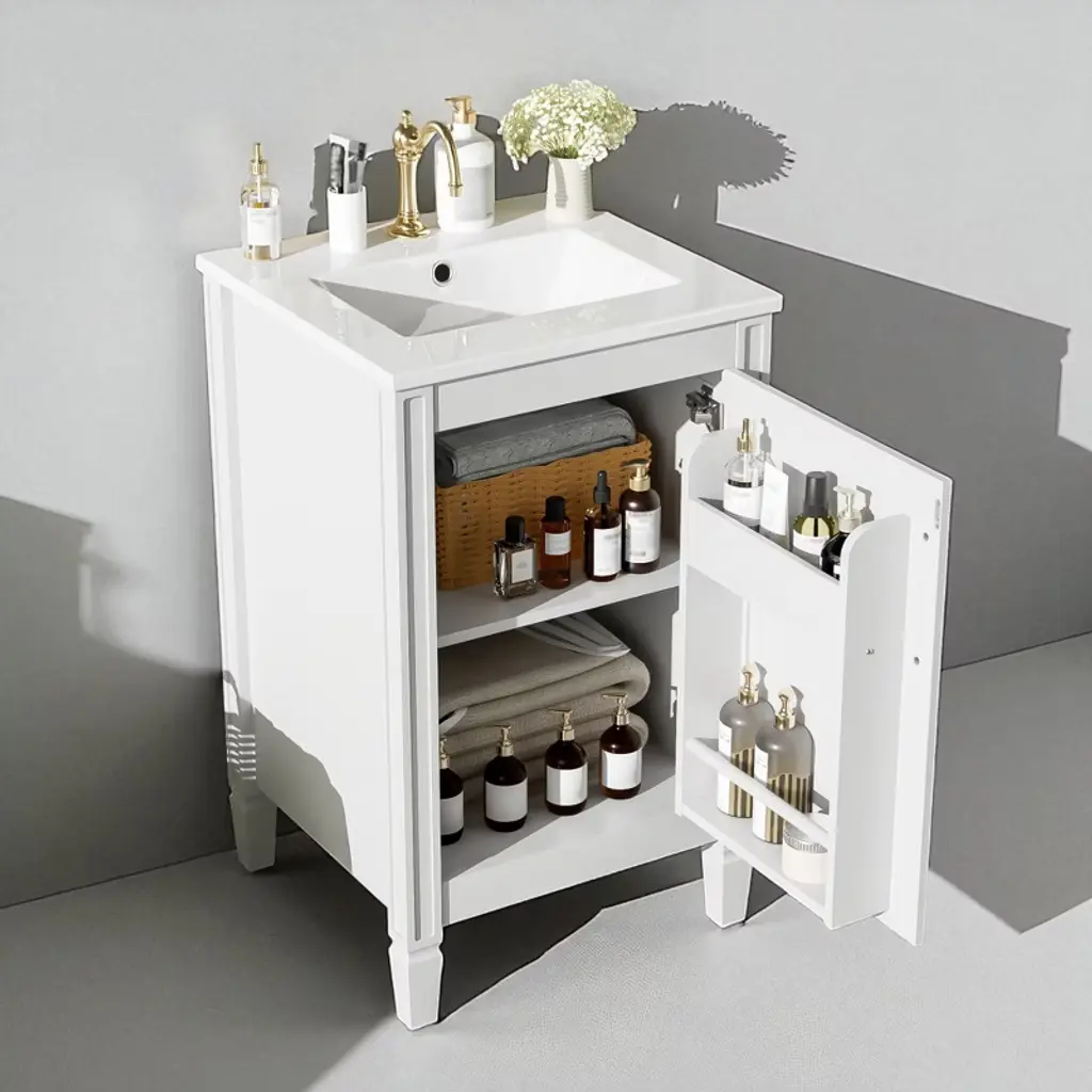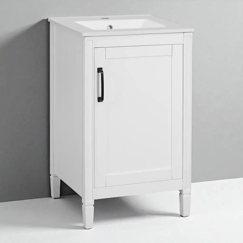 Product Overview Upgrade your bathroom with this 20" modern white vanity featuring a sleek painted finish and a stain-resistant ceramic sink. Designed to bring both charm and function to compact spaces, it offers clever storage through an adjustable U-shaped shelf and double door-mounted racks. Soft-close doors and smooth lines add a touch of tranquility and refinement, making this vanity the perfect addition to small bathrooms seeking space efficiency and timeless style. Product Features Compact Yet Spacious: Ideal for small bathrooms, this 20" vanity provides ample storage without occupying excessive space.Smart Storage Design: Includes a U-shaped adjustable shelf to accommodate plumbing, plus double shelves on the door to organize toiletries and smaller items.Ceramic Sink with Overflow: Durable ceramic basin resists scratches and stains, and features three pre-drilled faucet holes with an overflow for added protection.Quiet, Soft-Close Doors: Minimize noise and enhance user experience with smooth-closing hinges that prevent slamming.Sturdy and Durable Build: Constructed with solid wood legs and MDF cabinet body for long-lasting support and moisture resistance.Elegant Zinc Alloy Handles: Sleek, rust-resistant handles enhance the cabinet’s modern aesthetic and provide a comfortable grip.Flexible Shelf Adjustment: The inner shelf can be set at three different heights, offering versatile storage options for items of various sizes.Open-Back for Easy Plumbing: Back panel allows for simple plumbing installation and greater flexibility in bathroom layout.Quick Assembly: Designed for easy two-person assembly with included hardware and instruction manual. Specifications Product Dimensions: 20"W x 18.3"D x 33.8"HSink Dimensions: 20"W x 18.1"D x 6.5"HVanity Dimensions: 19.2"W x 17.8"D x 33.19"HWeight: 57.21 lbsWeight Capacity: Shelf: 35 lbs, Vanity: 67.1 lbsMounting Type: Free-standingCabinet Color: WhiteSink Material: CeramicCabinet Material: Solid Wood + MDFFinish Type: PaintedSink Type: Undermount / Drop-inSink Shape: RectangularFaucet Mount: Single Hole (faucet not included)Overflow Hole: YesVanity Top Edge Type: FlatEdge Thickness: 0.6"Number of Doors: 1Number of Drawers: 0Soft Close Hinges: YesAdjustable Shelves: YesAssembly Required: YesOrigin: VietnamIncluded: Cabinet, Ceramic Sink, Hardware, Instruction Manual Suitable Scenarios Perfect for small bathrooms, guest suites, and powder rooms, this vanity offers a refined appearance and well-planned storage. Whether you’re organizing a busy morning routine or refreshing your bathroom aesthetic, this space-saving vanity fits seamlessly into any transitional or modern décor. Notes Please assemble according to the instructions for best results and safety.Faucet not included – compatible with standard single-hole fixtures.Color and measurements may vary slightly due to manual measurement and lighting differences.