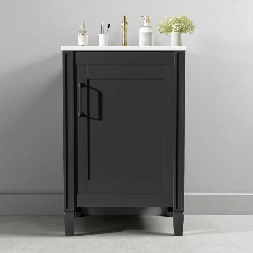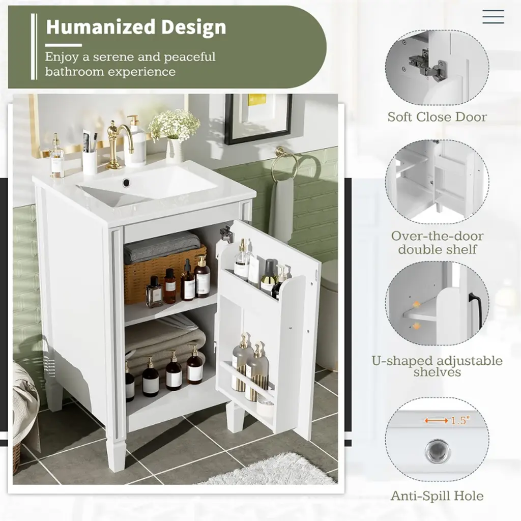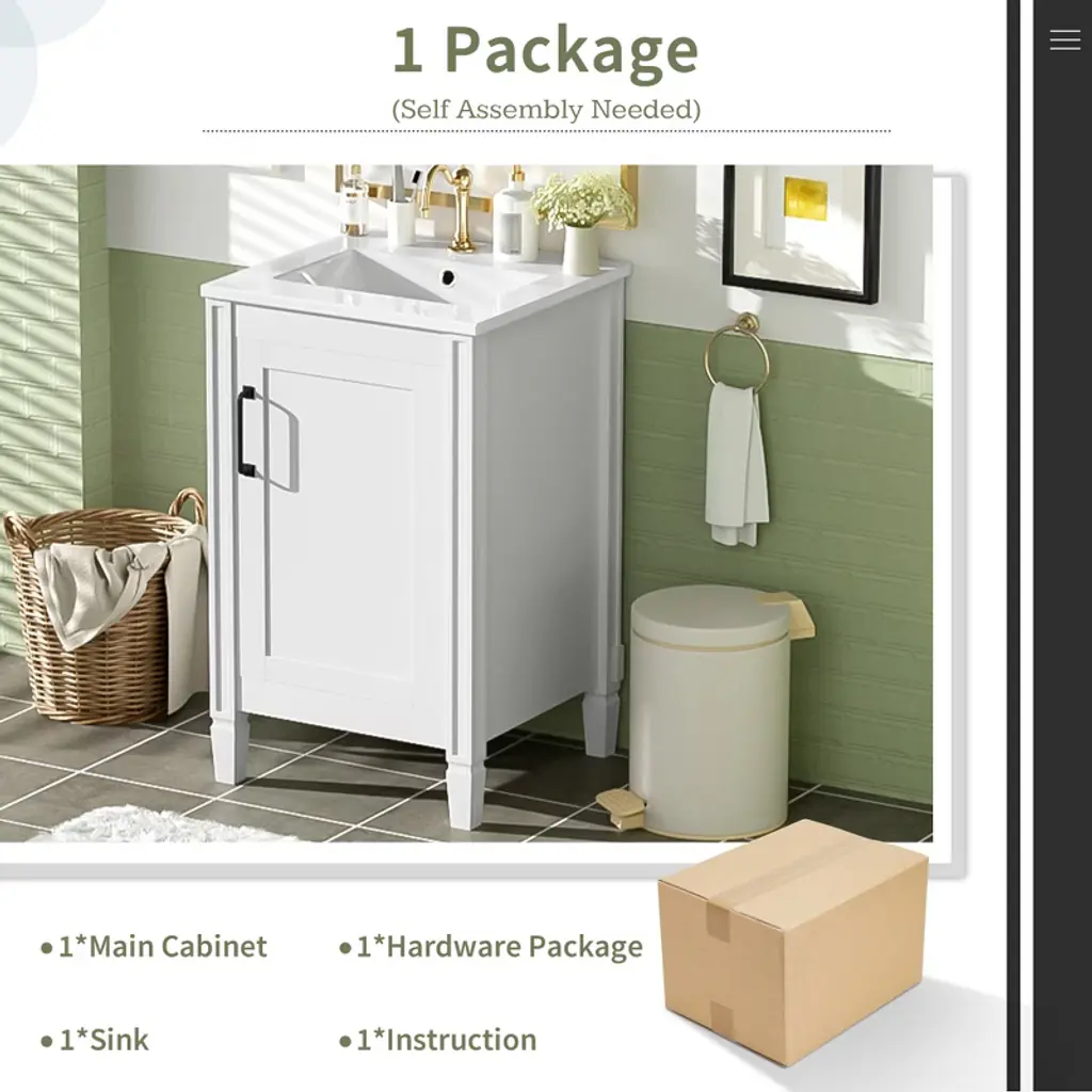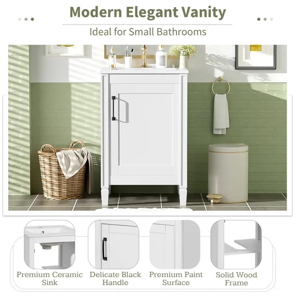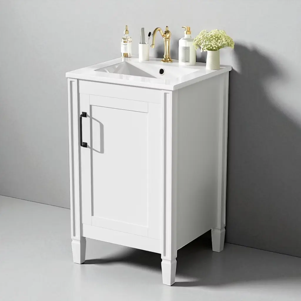 Product Overview Upgrade your bathroom with this 20" modern white vanity featuring a sleek painted finish and a stain-resistant ceramic sink. Designed to bring both charm and function to compact spaces, it offers clever storage through an adjustable U-shaped shelf and double door-mounted racks. Soft-close doors and smooth lines add a touch of tranquility and refinement, making this vanity the perfect addition to small bathrooms seeking space efficiency and timeless style. Product Features Compact Yet Spacious: Ideal for small bathrooms, this 20" vanity provides ample storage without occupying excessive space.Smart Storage Design: Includes a U-shaped adjustable shelf to accommodate plumbing, plus double shelves on the door to organize toiletries and smaller items.Ceramic Sink with Overflow: Durable ceramic basin resists scratches and stains, and features three pre-drilled faucet holes with an overflow for added protection.Quiet, Soft-Close Doors: Minimize noise and enhance user experience with smooth-closing hinges that prevent slamming.Sturdy and Durable Build: Constructed with solid wood legs and MDF cabinet body for long-lasting support and moisture resistance.Elegant Zinc Alloy Handles: Sleek, rust-resistant handles enhance the cabinet’s modern aesthetic and provide a comfortable grip.Flexible Shelf Adjustment: The inner shelf can be set at three different heights, offering versatile storage options for items of various sizes.Open-Back for Easy Plumbing: Back panel allows for simple plumbing installation and greater flexibility in bathroom layout.Quick Assembly: Designed for easy two-person assembly with included hardware and instruction manual. Specifications Product Dimensions: 20"W x 18.3"D x 33.8"HSink Dimensions: 20"W x 18.1"D x 6.5"HVanity Dimensions: 19.2"W x 17.8"D x 33.19"HWeight: 57.21 lbsWeight Capacity: Shelf: 35 lbs, Vanity: 67.1 lbsMounting Type: Free-standingCabinet Color: WhiteSink Material: CeramicCabinet Material: Solid Wood + MDFFinish Type: PaintedSink Type: Undermount / Drop-inSink Shape: RectangularFaucet Mount: Single Hole (faucet not included)Overflow Hole: YesVanity Top Edge Type: FlatEdge Thickness: 0.6"Number of Doors: 1Number of Drawers: 0Soft Close Hinges: YesAdjustable Shelves: YesAssembly Required: YesOrigin: VietnamIncluded: Cabinet, Ceramic Sink, Hardware, Instruction Manual Suitable Scenarios Perfect for small bathrooms, guest suites, and powder rooms, this vanity offers a refined appearance and well-planned storage. Whether you’re organizing a busy morning routine or refreshing your bathroom aesthetic, this space-saving vanity fits seamlessly into any transitional or modern décor. Notes Please assemble according to the instructions for best results and safety.Faucet not included – compatible with standard single-hole fixtures.Color and measurements may vary slightly due to manual measurement and lighting differences.